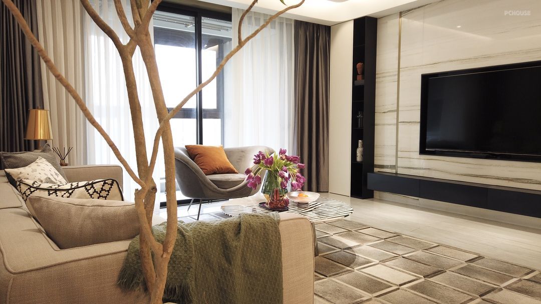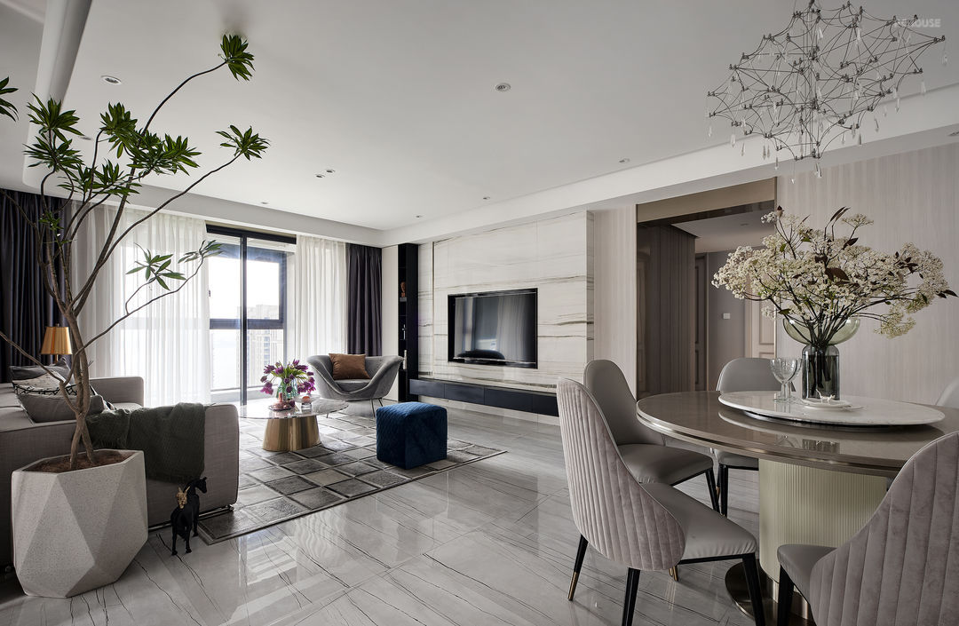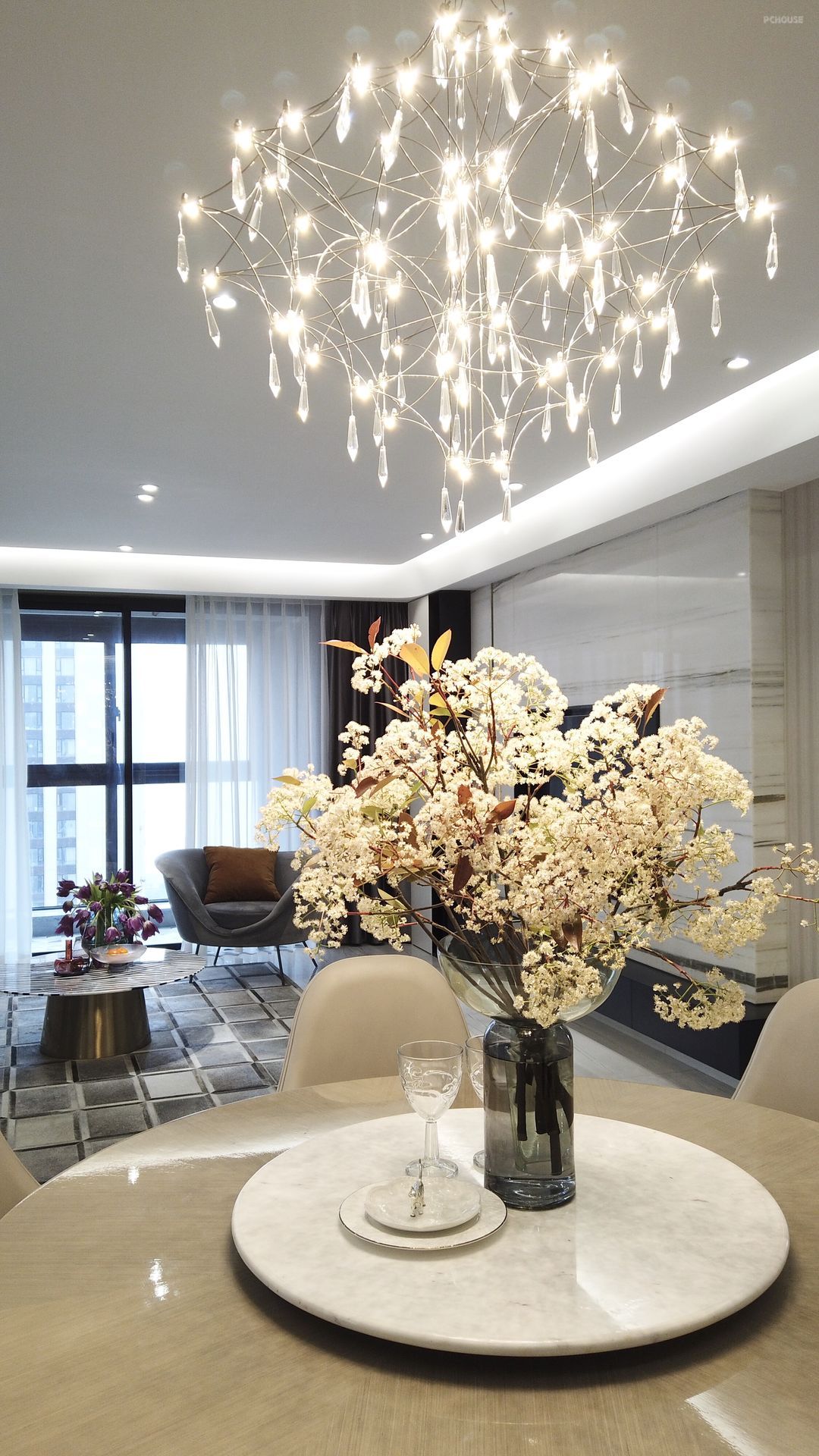 暖色灯光让空间变得柔软温馨,应季花卉增添生活气息,中和大理石、金属元素带来的高冷,更有「家的感觉」。