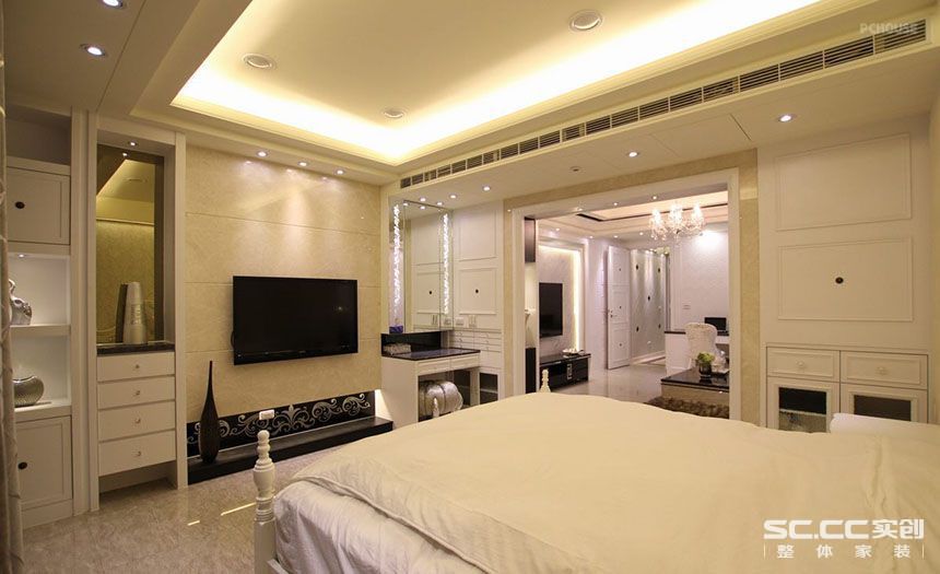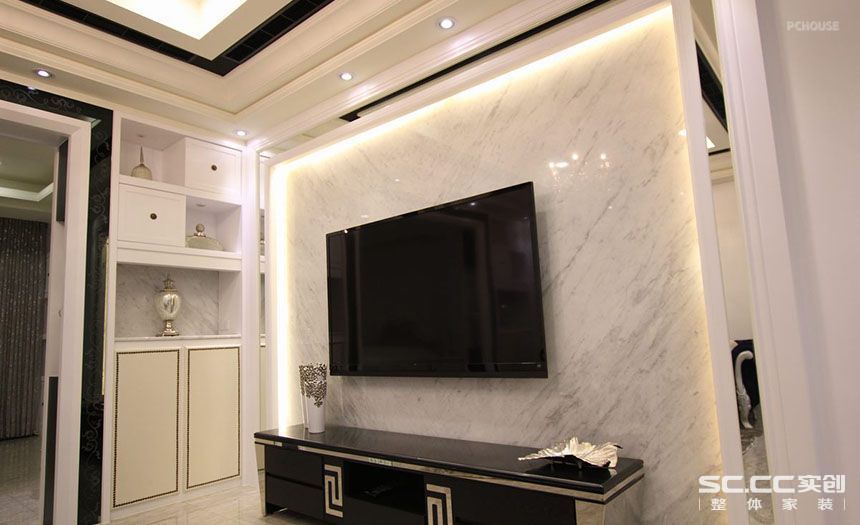 有了框与新古典家具的华丽堆衬,电视主墙仅用一面大理石材打上间接照明,表现出简约、大器;一侧的端景展示柜底板同样以石材铺陈。