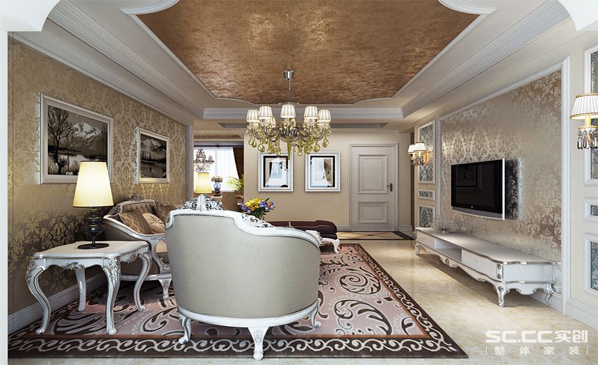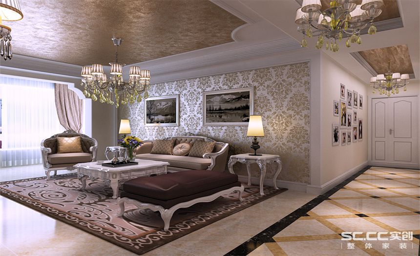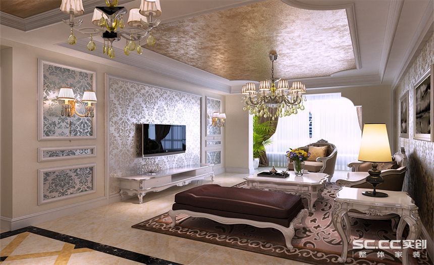 客厅顶部应用了大型灯池,并用华丽的枝形吊灯营造气氛。