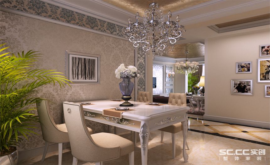 前言: 客厅沙发背景墙设计上延续了欧式风格的主元素,并融入了现代的生活元素,石膏线与壁纸的结合是欧式风格的最高境界。电视背景墙的设计上简化了传统欧式的装修风格,采用护墙板与壁纸的搭配,欧式壁灯作为点缀,突显高雅大气感觉。餐厅背景墙的设计上用:U字的造型,壁纸与石膏线搭配,显得精致并且华丽。客厅顶部应用了大型灯池,并用华丽的枝形吊灯营造气氛。