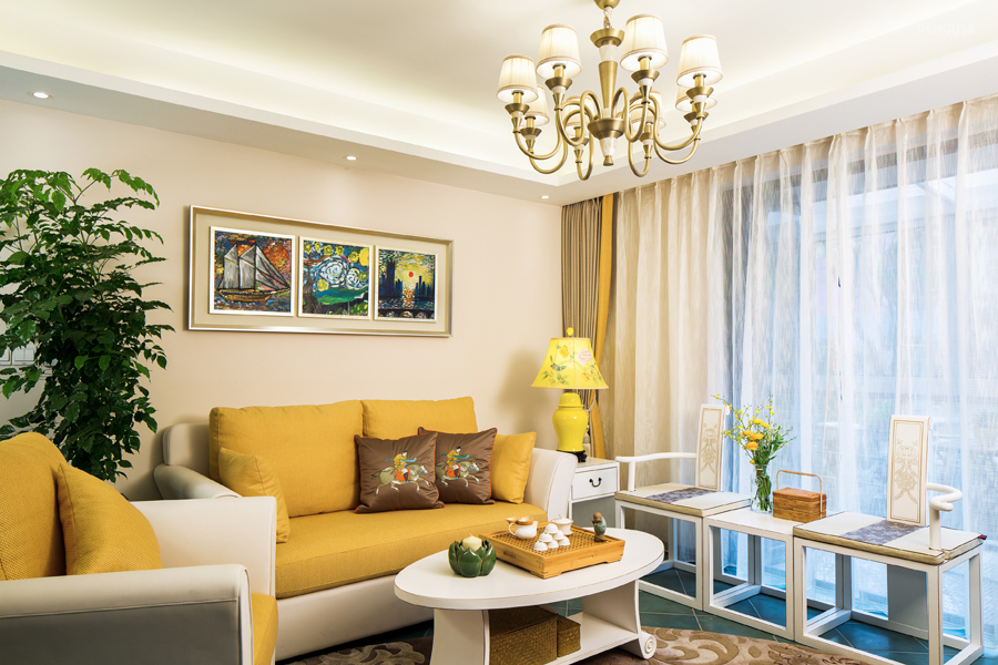 客厅家具的重头戏是暖黄与白拼色沙发。同色系的窗帘、吊灯、台灯乃至茶几上的托盘, 以深浅有致的不同明度、纯度的棕黄色渲染出温馨氛围。沙发背后,墙上的装饰画同样来自小业主的手笔, 深蓝空间将三幅小型油画统一装裱起来,赋予空间美感的同时,亦是一份骄傲的纪念。