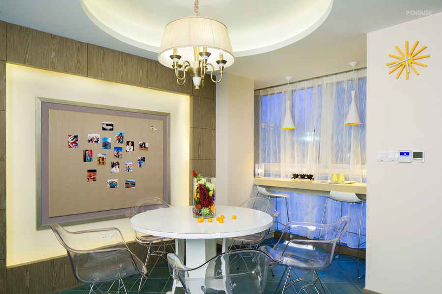 现代简洁风的餐厅,墙上应业主要求预留出一面软包,方便粘取各种物件 —— 比如怀旧照片、即兴创作的灵感画与文字。餐厅特意挑选了透明材质圈椅,够大够舒适,又因通透而不挤占空间的视觉。