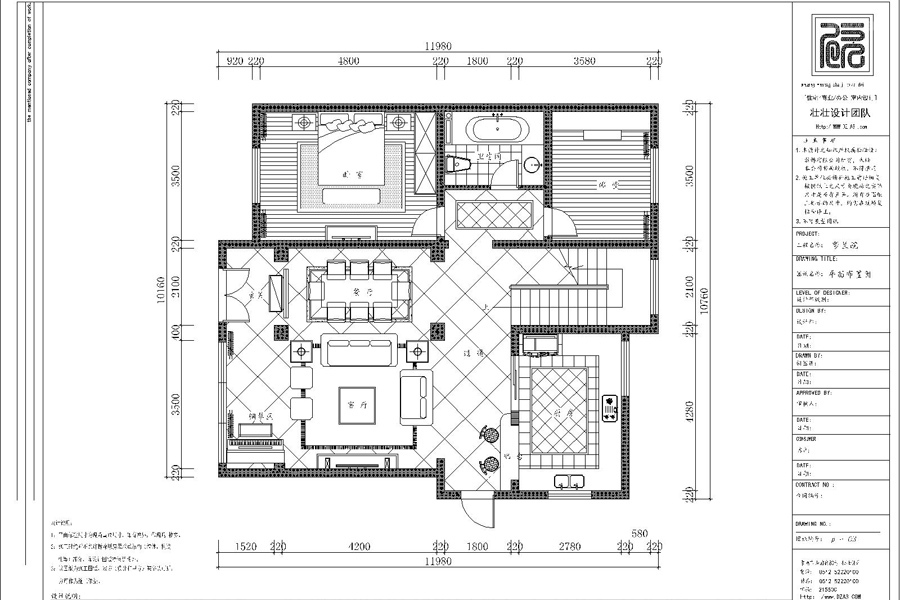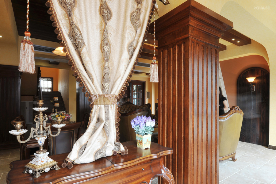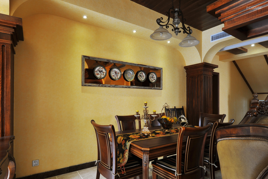 因考虑客厅不显的那么空旷,以及希望厨房与餐厅能分开成为独立的空间,所以把餐厅的位置设计到客厅的后面,这样的格局调整不仅能让每个空间都能独立而互不干扰,也使之前空旷的客厅丰富了起来,整个客厅的墙面和顶面运用到仿肌理漆的墙纸,体现了强烈的质感和丰富了墙面的内容,做到整体的统一性.在电视背景墙上厚重色调的墙纸与米白色调的石材体现出刚柔质感的强烈对比.在改动后的餐厅区域被四个木质立柱所包围,围合感很好,餐厅背景墙用了木框、茶镜、美式碟子所表框好的装饰挂件,来代替常规的装饰画
