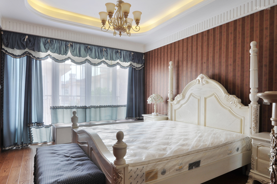 一进入房间,就知道这是一间女儿房,暖红色的格子墙纸与白色做旧木质的公主床,在加上绿色格子小圆点的窗帘,诠释了当下的花季少女时的青春时光。装饰品的点缀上,从蕾丝花边的台灯、古铜色的公主镜,再到仿古式的相框都是根据整体的风格和喜好静心挑选