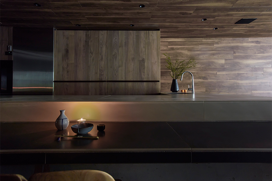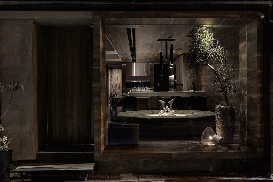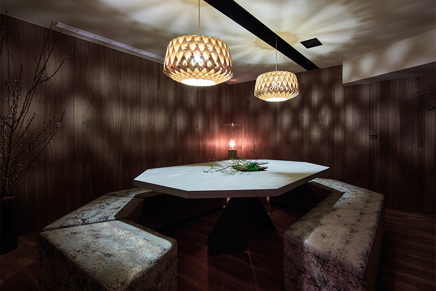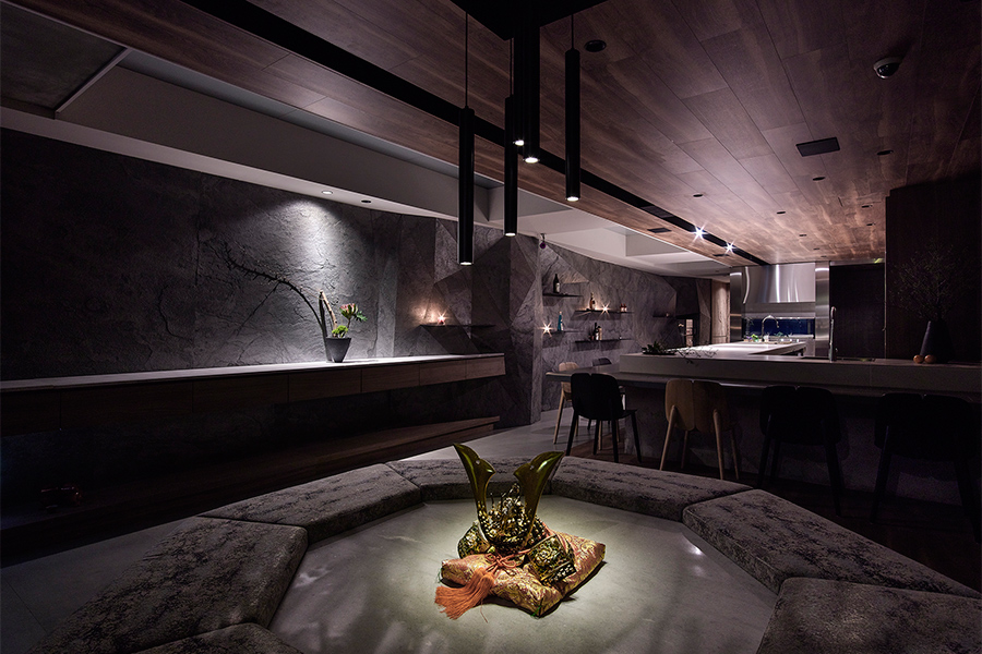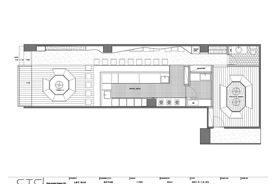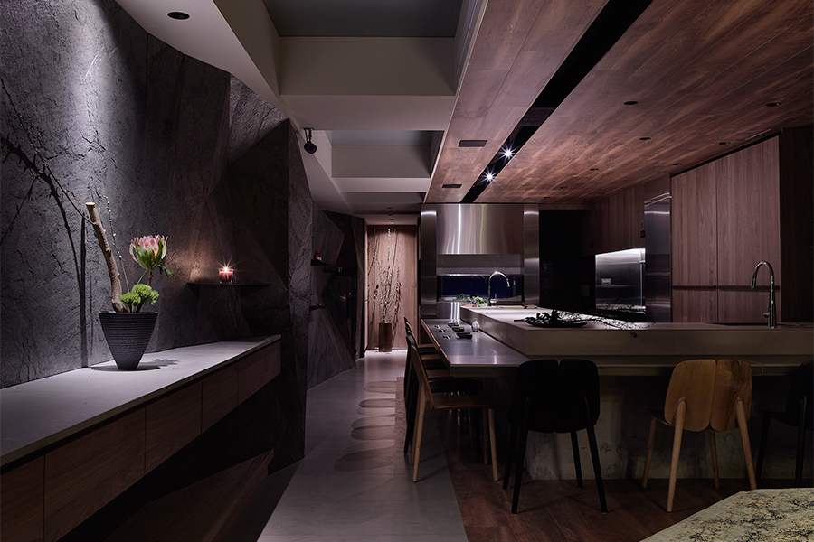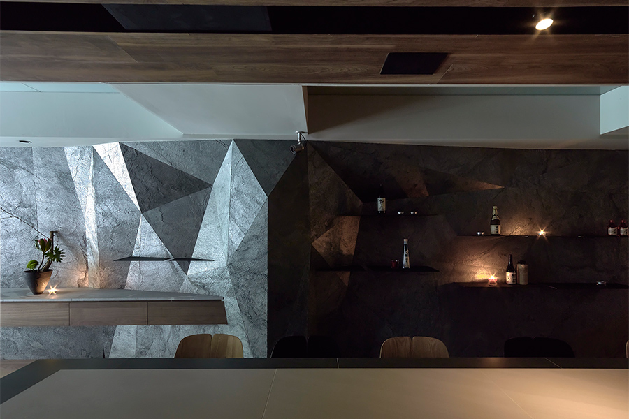 前言: 此案以木质色为基底搭配明显的灰色石英牆,灰白的大理石桌平衡色彩,同时为了张显不同区域的特色,运用了粗糙与光滑、温暖与冰冷的材质对比,产生了张力与张力的平衡。另一方面此空间为面长型的空间,为了更凸显空间的张力,扩大店面的视觉效果,特以凹凸的石英牆面与光线的配合以及木质线条的延展,将视线从入口一路延伸至底,创造出空间层次,让单一空间产生对话。木纹的温度使得餐厅回到最原始的味道,做出最温暖人心的料理,不再夸张的修饰,颜色不再那麽强烈,线条不再复杂,不论主厨或用餐者皆可以沉淀,沉浸在这空间,藉此层次的氛围转化成享受于表演后的馀韵,带给用餐者更深层的情绪感受,形成料理与空间美好的画面。 挑战不同的空间视觉效果,在入口佈置窗橱的效果,打破日本料理神秘封闭的门面採用大面窗景效果,入口的八角升降桌放低可供展室佈置,声高可供八人用餐,吧台对面延伸的立体石板牆面串起空间主题,打破既有日本料理吧台印象,取消冰箱在吧檯上的既有操作模式,打开料理者与客人间的距离,料理即是一种表演,师傅诚心为客人准备食材。搭配客人聚餐的需求,规划非吧台位置,入口的八人桌及俱隐私效果的包厢区。 This case used the design of wooden base and a clear gray quartz walls. Gray marble table could balance the color and emphasize the characteristics of different regions. And we use the factors rough with the smooth; warm with the cold, which are the contrast materials to result in a balance of tension. On the other hand, this is a long-space design in order to highlight the tension and the store could get the expanded visual effects.