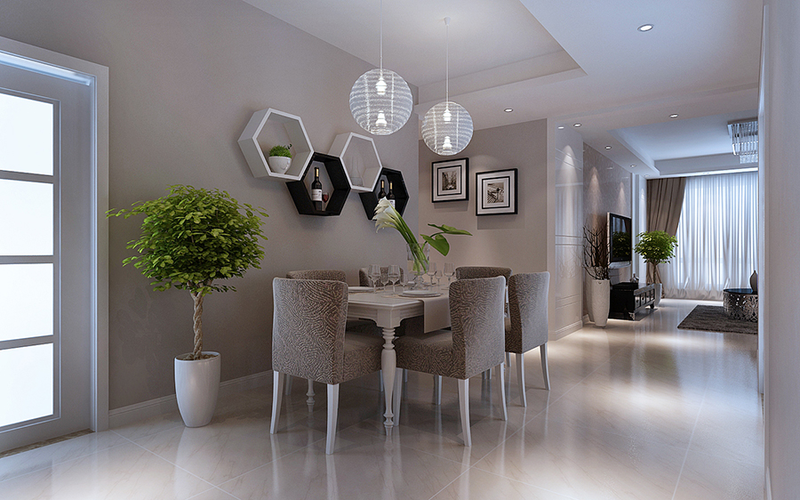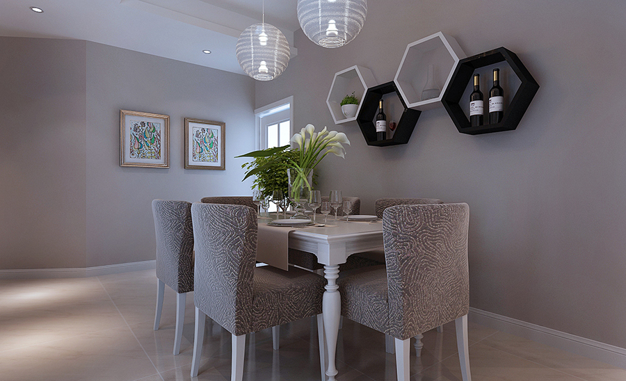 进入餐厅,一眼望去,灰白色为主体,浅色调为背景,十分清爽干净,在简约装饰中搭配着些许绿色,代表着健康阳光,在进餐时给人足以的温馨感。