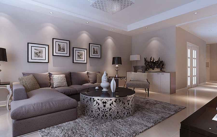 客厅区域,墙上的壁画和柜子上的艺术品象征着主人对艺术方面的喜爱和欣赏品味,吊顶的线平直条规矩并且徐徐渐进,将空间结构感在无形中勾勒出来。沙发、茶几的布局与选购充满现代感,将主人对家居个性化的理念淋淋尽致的展现出来。