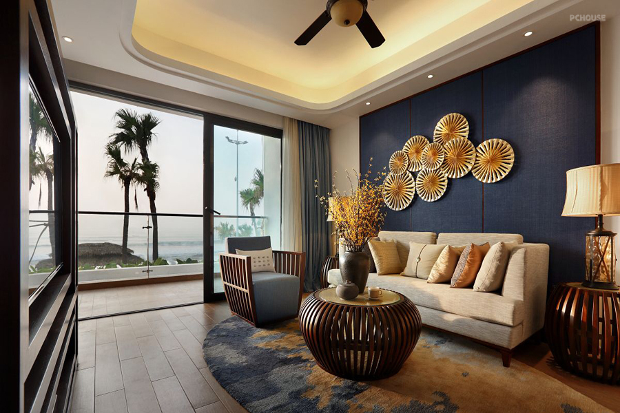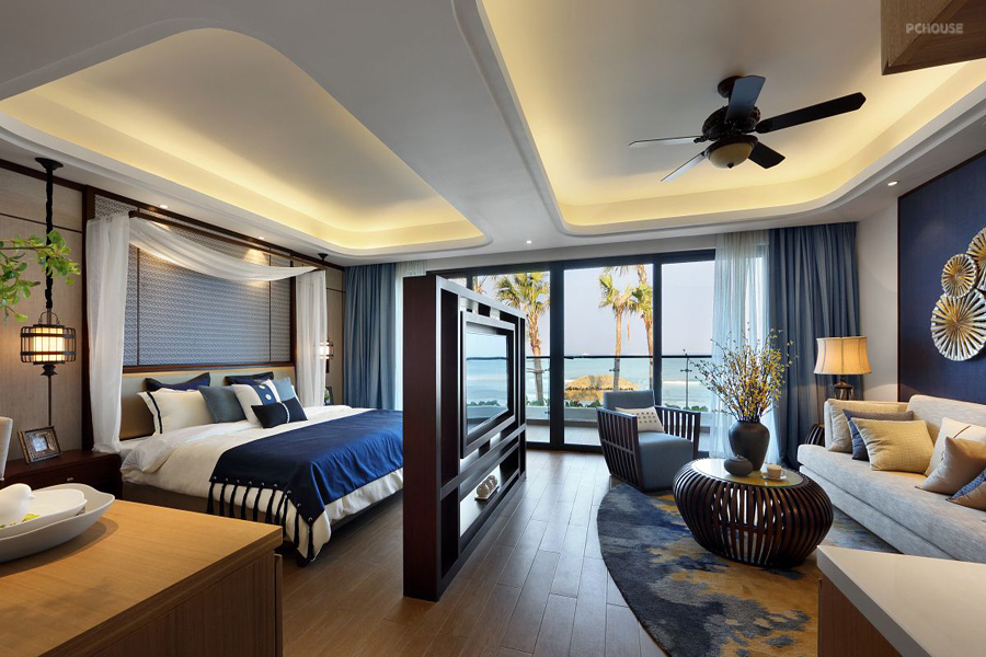 前言: 阳光通过通透的落地窗洒落屋中,充足的照明让光影的变化成为了屋中的另一道风景。细细品味 ,这里的房间总有种静逸的味道,床头两侧的吊灯也非常符合这里的风格,镂空设计简单却极富韵味,个头不大却为这里增添了一抹耐人寻味的感觉。推拉式的玻璃门分离出居住空间和阳台,虽然是个隔断却并没有将阳光和美景阻隔在外,通透的玻璃将室外景色引入屋中,这里到处充满了度假的味道。 晚上的空间氛围有一份脱离世俗的宁静,在晚霞的柔和光线下,大海也穿上了柔美的外衣,不同于白日的阳光四射,浪漫的氛围正越来越浓。室外的灯光不那么明亮,却在灯光的柔和点缀下烘托出神秘而暧昧的气息,海面的水幽蓝而深邃,漫步在柔软的海滩上,多少浪漫的故事也由此开演。