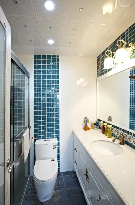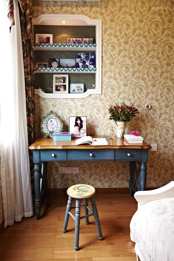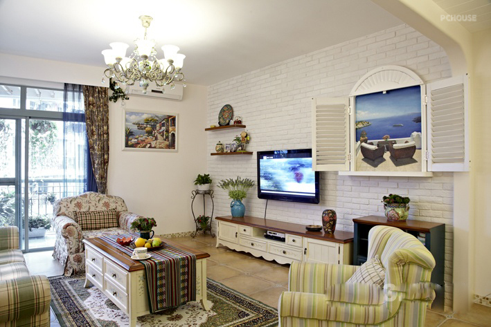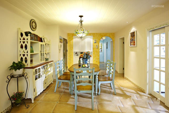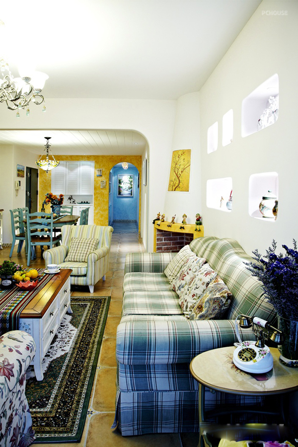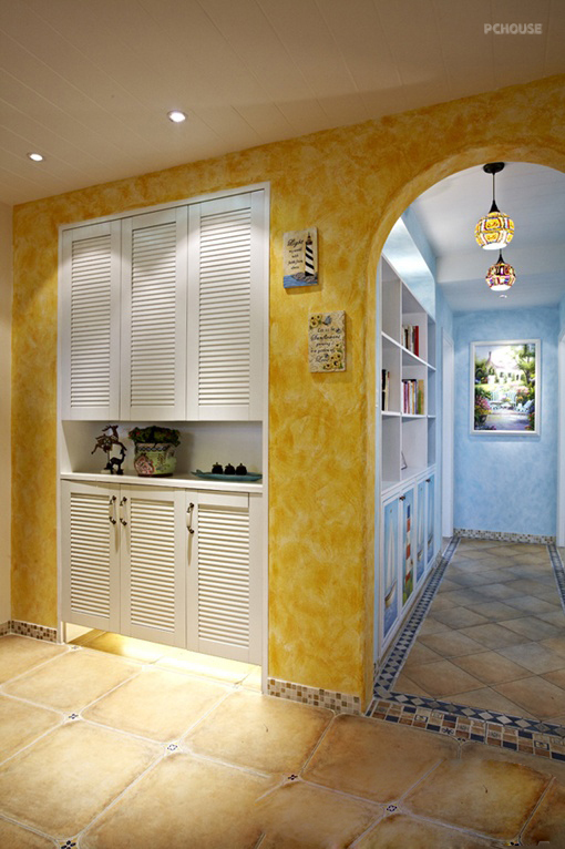 前言: 那年的秋天,遇见了喜欢色彩浓烈的Sunny , 她曾经去过很多地中海周边国家,也很怀念那些美好的日子,于是与她一起打造了这样一个五彩缤纷的家。后来,她自己形容说她很喜欢她的家,现在走到哪里都没有家舒服.这个三居室的房子,户型的特点是每个房间几乎都不方正,但也正因为这样,给了设计很大的想象空间。房间的采光很不错,而且有两个比较大的阳台,依然清晰的记得第一次去看现场,主卧室窗外的风景非常的美,站在窗边望去,只见眼前一片绿色点缀的橙红色的花海,当时惊喜的呆望了许久,一个异域风情的空间慢慢的在脑海里呈现出来了。色彩在这个空间里得到了比较好的运用,过道和玄关用了蓝与黄的对比色艺术涂料,搭配上田园风格的地砖,孔雀蓝的实木家私,使这些空间显得梦幻而柔美,独特并且活泼, 而客厅和餐厅运用了平和一些的田园元素,文化墙、装饰性的壁炉等,厨房和卫生间都采用了几种色彩的砖混搭,这些生活的空间感觉舒适而轻松。整套房子的家私大部分都采用了全实木的材质,软装上凸出有质感的布艺,缤纷可爱的饰品,主墙的百叶窗内嵌的装饰画是屋主想起曾在国外住过的一个酒店的风景,这种感觉是很温馨而美好的。