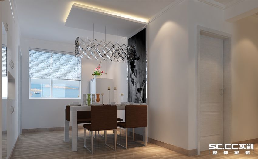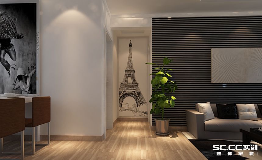 用斜切的石膏板和黑色两色交叉的背漆玻璃做出摩登的巴黎风采,简单的家具脱出简约的浪漫,温馨的地板让整体空间活泼起来