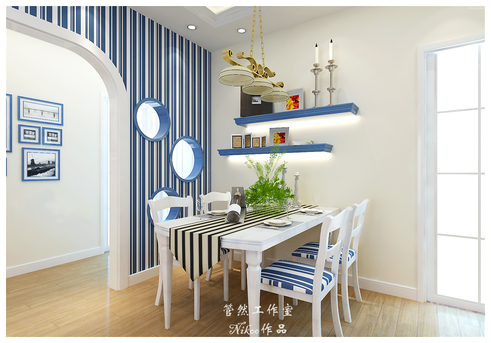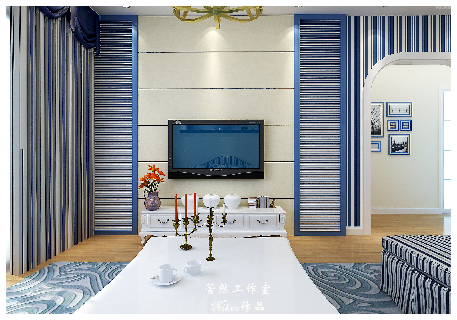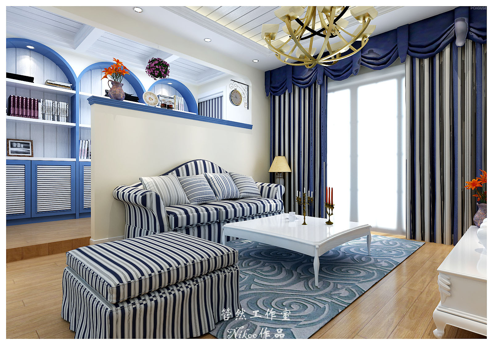 前言: 套内面积65平米,小三房。本案大量运用代表地中海风情的蔚蓝色和纯白色,使用大面积的白色肌理涂料和大纹理的白色木材,把蔚蓝色作为点缀,再结合百叶窗及装饰柜,给人一种海边小屋的舒适感受。该空间设计尽量采用低彩度、线条简单且浑圆的木质家具,沙发及抱枕的布艺特别采用蓝白相间的条形图案,与地中海风情交相辉映。在自然光和灯光的相互作用下,整个空间尽显柔美与舒适。