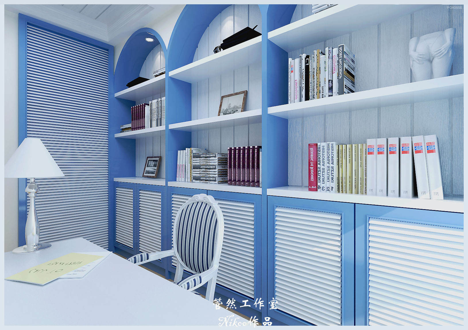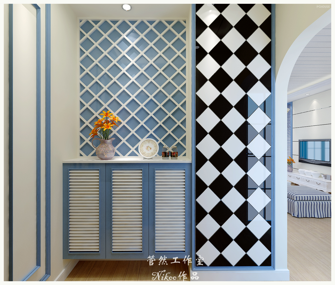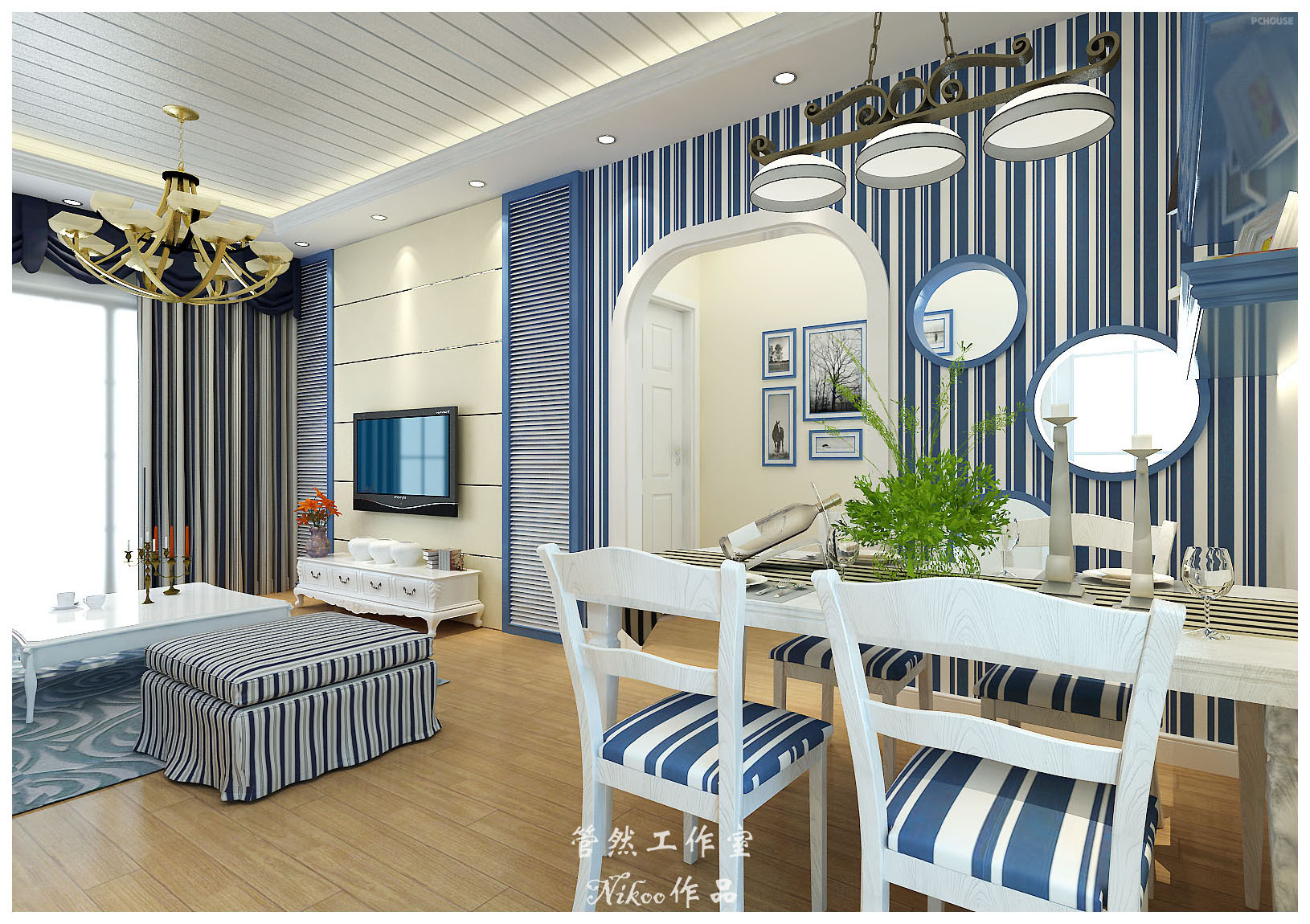 前言: 套内面积65平米,小三房。本案大量运用代表地中海风情的蔚蓝色和纯白色,使用大面积的白色肌理涂料和大纹理的白色木材,把蔚蓝色作为点缀,再结合百叶窗及装饰柜,给人一种海边小屋的舒适感受。该空间设计尽量采用低彩度、线条简单且浑圆的木质家具,沙发及抱枕的布艺特别采用蓝白相间的条形图案,与地中海风情交相辉映。在自然光和灯光的相互作用下,整个空间尽显柔美与舒适。
