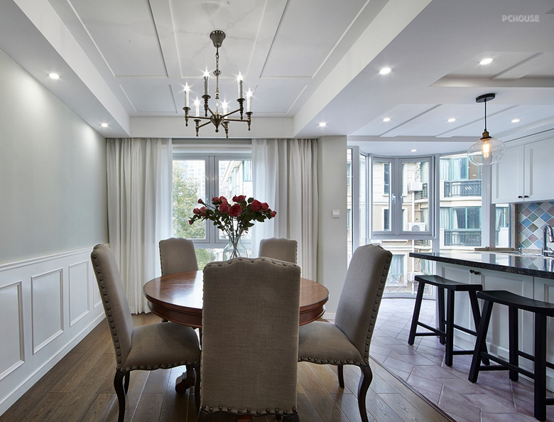 客厅上讲究层次,用实木做出结实的框架,中间用棂子雕花,体现古朴的气质。天花以木条相交成方格形,上覆木板,也可做简单的环形的灯池吊顶。黑色的台灯和电视柜以及暗色的窗框体现了现在的前卫感,同是彰显出复古的韵味,体现出主人的内涵修养。