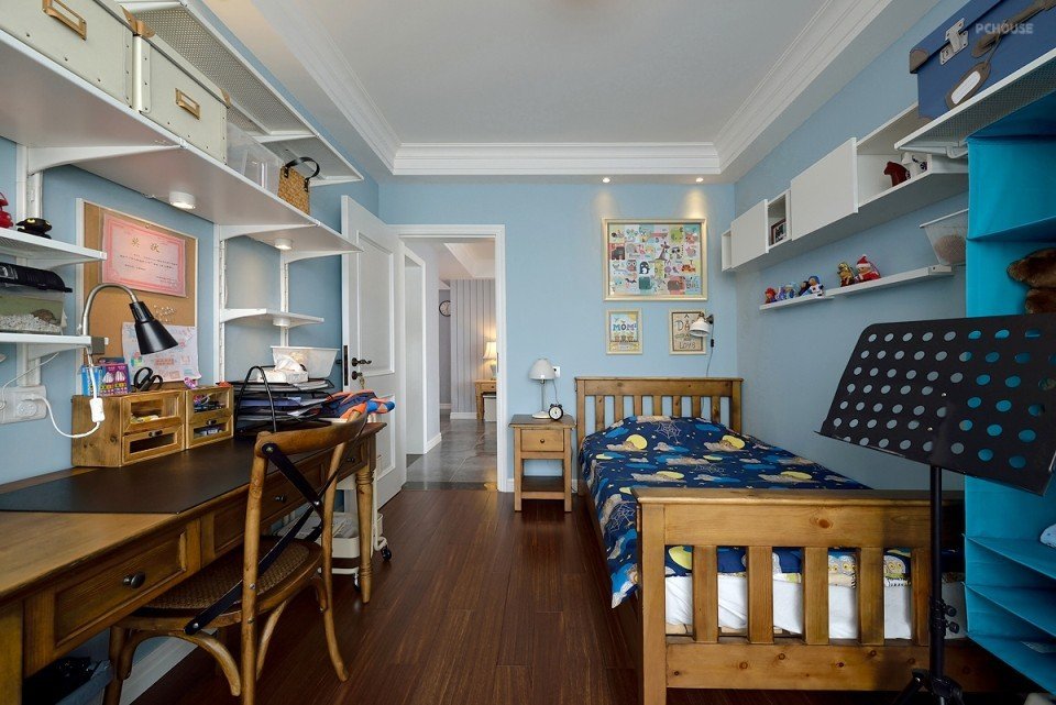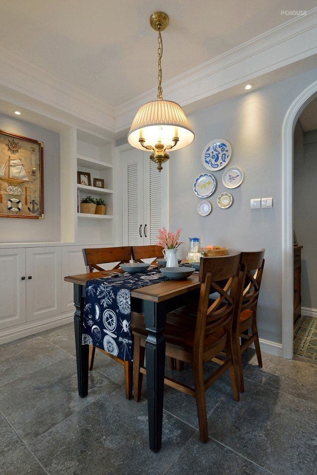 餐厅以美式风格为主,蓝色的墙漆使得空间宽畅明了,餐厅采用照片墙的效果,既起到装饰作用,又给人温馨素雅的感觉。餐厅和客厅相互呼应、蓝色的墙漆,简单的装饰,让空间得到了很好的利用,同时也体现初户主对生有着独特的品味