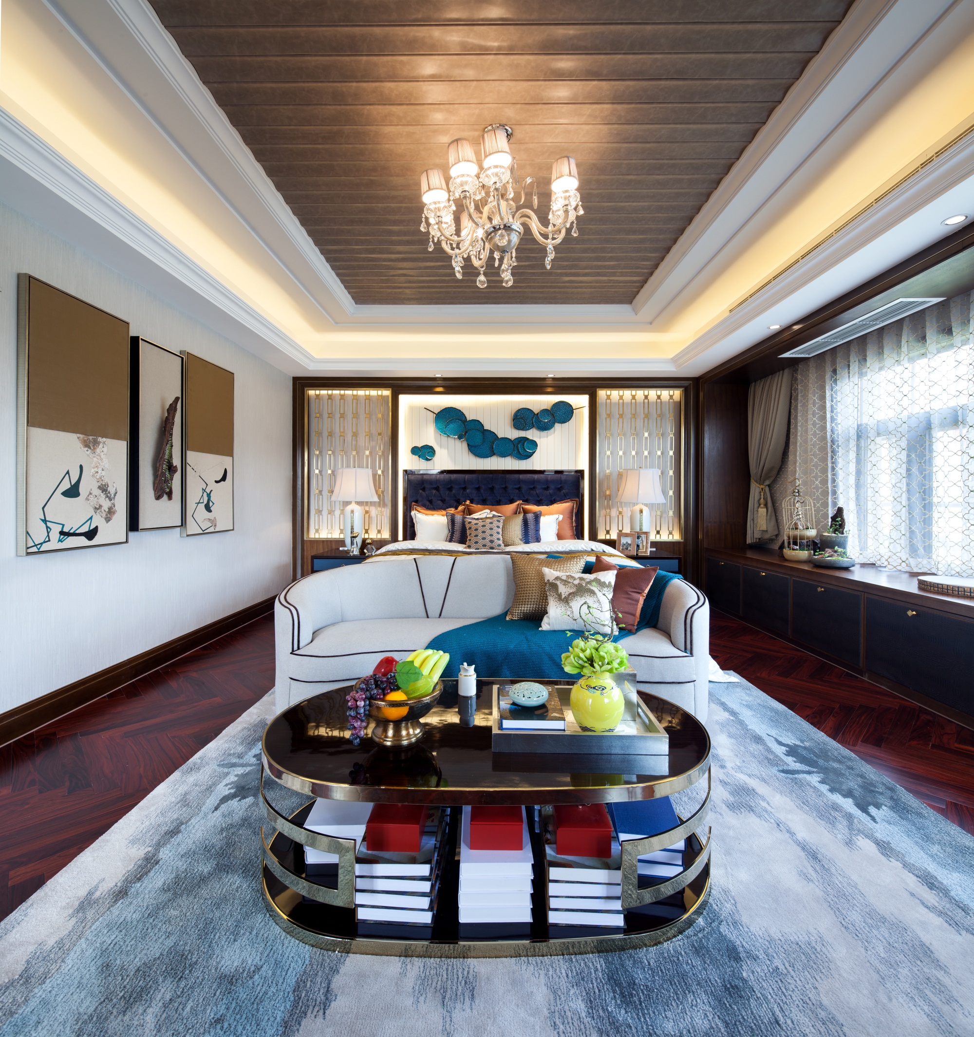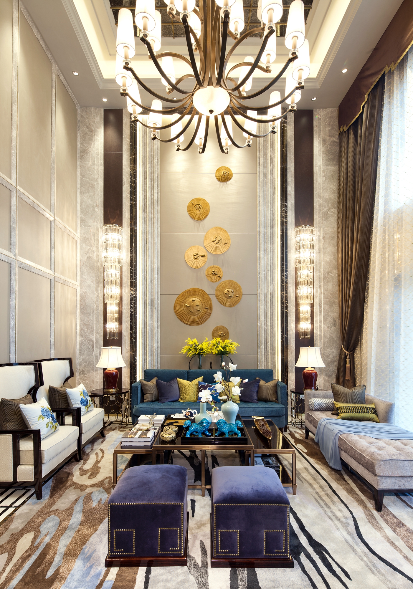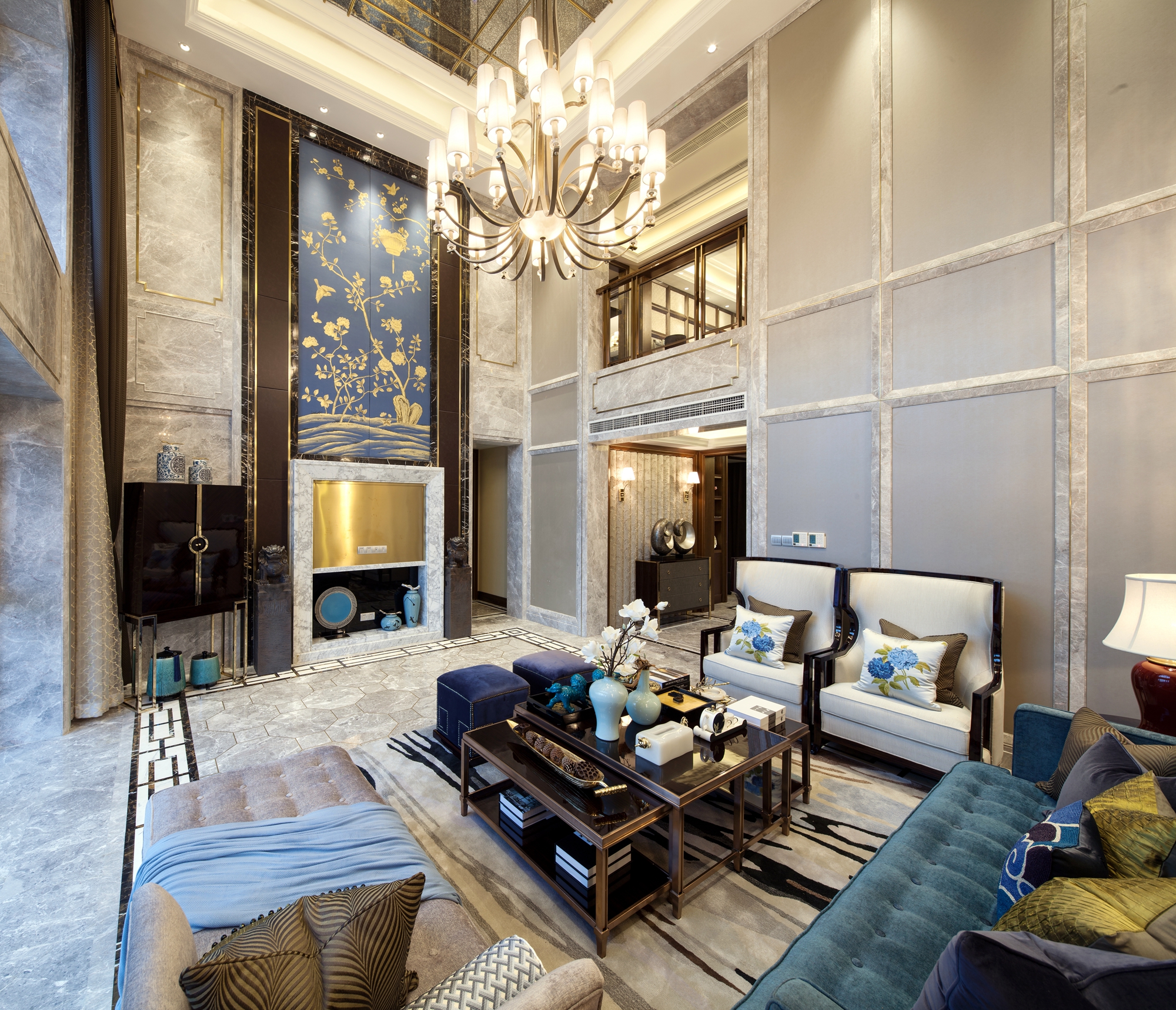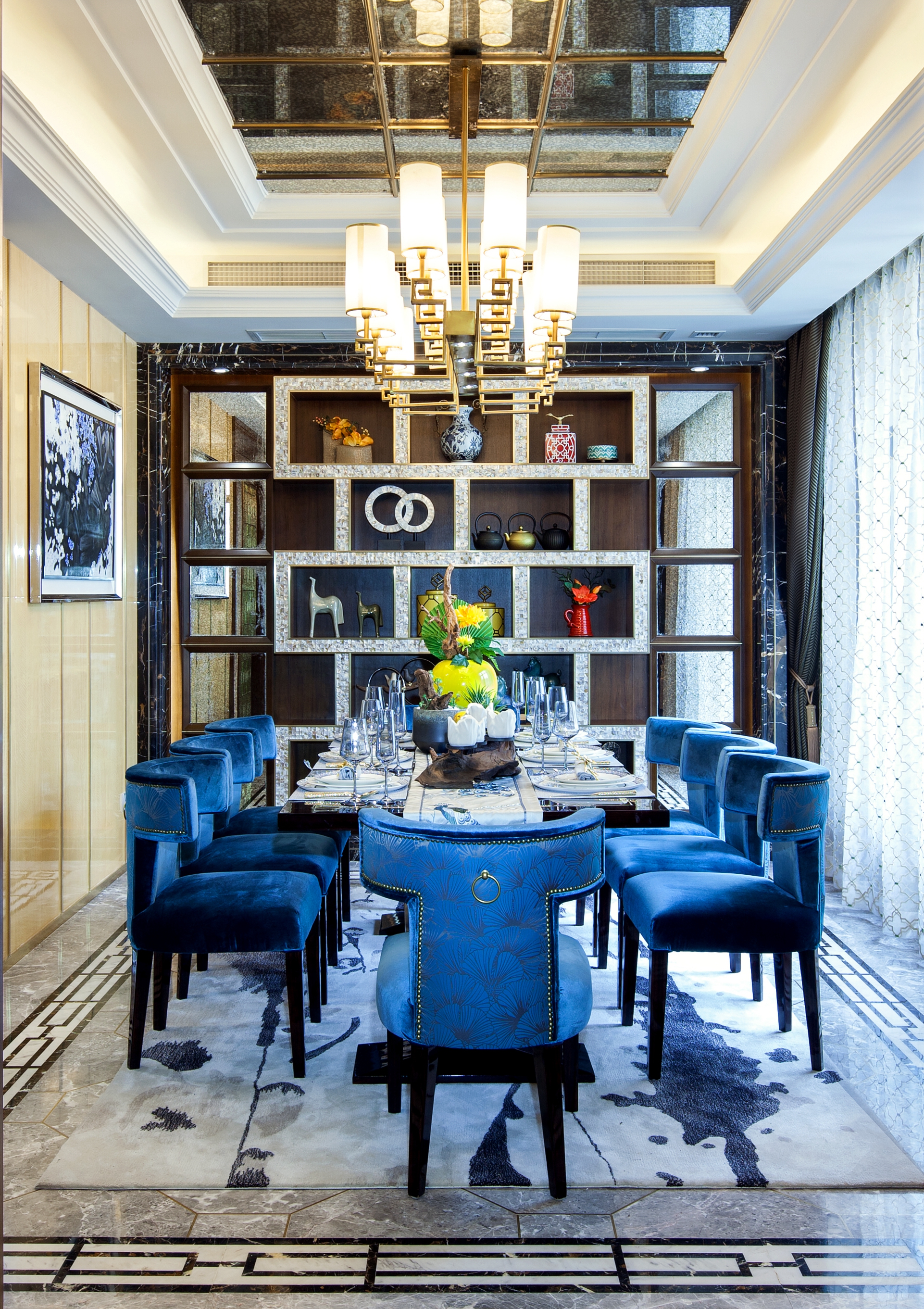 前言: 项目名称:重庆恒大御景半岛A4-4别墅 项目面积:425㎡ 完成时间:2015年 风格调性:简欧与中式混搭 软装设计:百搭园软装 在这套425平米的别墅中,设计师延续了巴渝文化中心的悠久历史与稀缺的文化风情,巧妙地将西式居住于中式现代相糅合,独具匠心,形成一座贵气优雅、别具内涵的住宅空间。整座别墅让生活习惯与精神文化的相结合,完美体现了传统信仰与优雅风情的气质交融。 整个空间以深咖啡色及大地色系为主,搭配大量的湖蓝色及亮黄色,让空间呈现出丰盈的层次感。中西方元素搭配,陈设品以陶瓷为主,再以恰到好处的绿植和花艺点缀,令整体环境优雅而又不乏生机。 走进客厅,似乎走进了东方的文化艺术馆。挑高层架构让整个客厅显得更加大气,湖蓝色的简欧沙发成为整个空间的色彩中心。随后,无论是抱枕上的牡丹花、高高低低的陶罐还是墙上的挂画,都以这个色彩进行延伸与呼应。除此之外,空间运用到了许多传统的中式元素,玄关的柜子上的青花、茶几上摆放着的麒麟摆件、主背景墙上分别用蓝色的梅花挂画与金色挂件配以黄色花饰,将自然与艺术相结合,让空间的东方美自然呈现。 餐厅延续了客厅湖蓝与亮黄的色彩搭配,白底青花图案的餐盘与金色的餐具搭配,朴实的东方情怀中透露着奢华与贵气,桌上的小绿植和木雕松果,让这样一个略显秩序感的就餐环境,多了几分轻松与亲切。餐厅入口处的两个立柜,后面的壁柜构成造景框,加上各种陶瓷及艺术品摆件,无疑是中式元素的最好代表。 在二楼的空间,设置有主人房、书房、小会议厅、健身室、棋牌室、客房等空间。而设计师顺应了别墅主人西式的生活习惯,并又热爱中式传统文化的信仰,采用简欧风格大床搭配具有弧形线条的沙发和简约的柜子,配上祥云的挂画、陶瓷摆件、水墨山画地毯表达出主人享受现代生活的乐趣的同时也追求传统文化。客房设计关照居者对生活广而大的需求,以欧式简约与现代中式的风格为基础环境,利用床上用品、挂件、柜地毯的色彩来实现不同区域的区分,呈现空间丰沛的美学力量。 书房当然也是充满书香和水墨的气息,传统的剪纸挂画、中式现代的案台、沿墙面而设的书柜以及山峦叠起的水画地毯……呈现极浓的书墨香。每个空间设计师都向生活和习惯找到生活真正的范本,并且从中吸收忠实于现代生活的语言,让居家的奢华元素凝练为匹配财富阶层应有的生活方式。