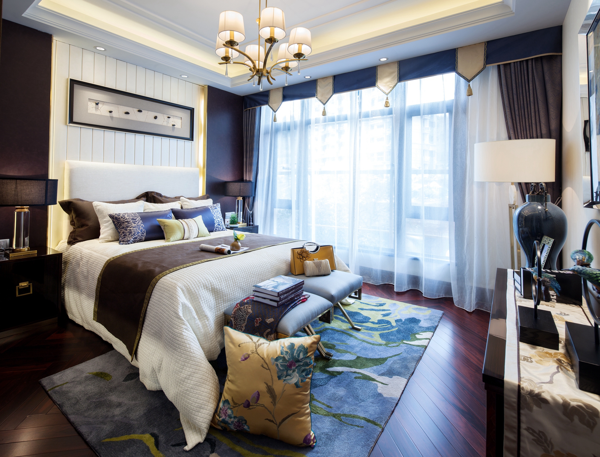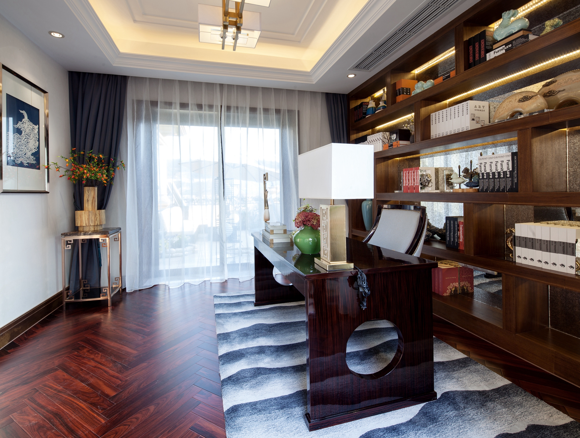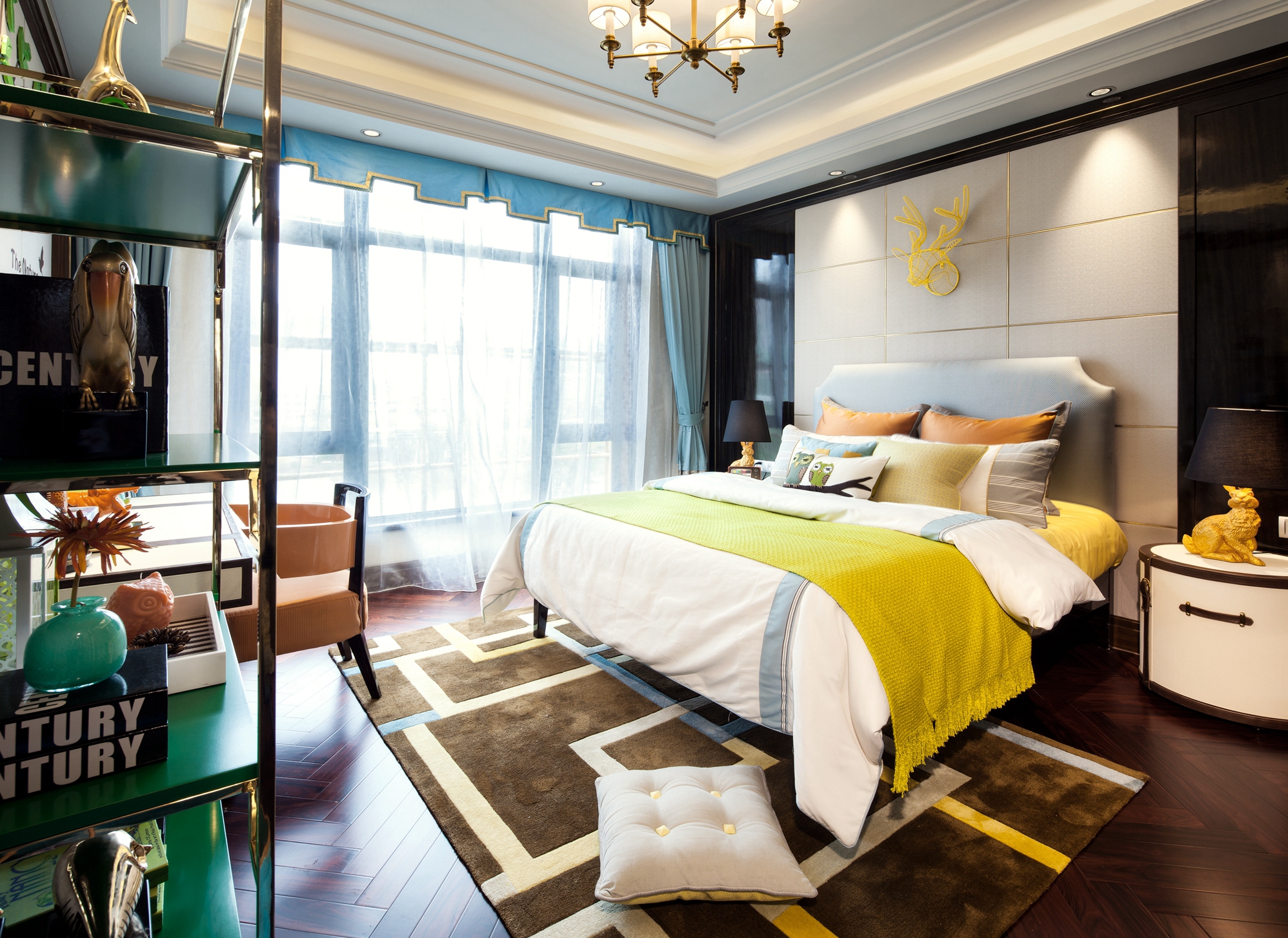 前言: 项目名称:重庆恒大御景半岛A4-4别墅 项目面积:425㎡ 完成时间:2015年 风格调性:简欧与中式混搭 软装设计:百搭园软装 在这套425平米的别墅中,设计师延续了巴渝文化中心的悠久历史与稀缺的文化风情,巧妙地将西式居住于中式现代相糅合,独具匠心,形成一座贵气优雅、别具内涵的住宅空间。整座别墅让生活习惯与精神文化的相结合,完美体现了传统信仰与优雅风情的气质交融。 整个空间以深咖啡色及大地色系为主,搭配大量的湖蓝色及亮黄色,让空间呈现出丰盈的层次感。中西方元素搭配,陈设品以陶瓷为主,再以恰到好处的绿植和花艺点缀,令整体环境优雅而又不乏生机。 走进客厅,似乎走进了东方的文化艺术馆。挑高层架构让整个客厅显得更加大气,湖蓝色的简欧沙发成为整个空间的色彩中心。随后,无论是抱枕上的牡丹花、高高低低的陶罐还是墙上的挂画,都以这个色彩进行延伸与呼应。除此之外,空间运用到了许多传统的中式元素,玄关的柜子上的青花、茶几上摆放着的麒麟摆件、主背景墙上分别用蓝色的梅花挂画与金色挂件配以黄色花饰,将自然与艺术相结合,让空间的东方美自然呈现。 餐厅延续了客厅湖蓝与亮黄的色彩搭配,白底青花图案的餐盘与金色的餐具搭配,朴实的东方情怀中透露着奢华与贵气,桌上的小绿植和木雕松果,让这样一个略显秩序感的就餐环境,多了几分轻松与亲切。餐厅入口处的两个立柜,后面的壁柜构成造景框,加上各种陶瓷及艺术品摆件,无疑是中式元素的最好代表。 在二楼的空间,设置有主人房、书房、小会议厅、健身室、棋牌室、客房等空间。而设计师顺应了别墅主人西式的生活习惯,并又热爱中式传统文化的信仰,采用简欧风格大床搭配具有弧形线条的沙发和简约的柜子,配上祥云的挂画、陶瓷摆件、水墨山画地毯表达出主人享受现代生活的乐趣的同时也追求传统文化。客房设计关照居者对生活广而大的需求,以欧式简约与现代中式的风格为基础环境,利用床上用品、挂件、柜地毯的色彩来实现不同区域的区分,呈现空间丰沛的美学力量。 书房当然也是充满书香和水墨的气息,传统的剪纸挂画、中式现代的案台、沿墙面而设的书柜以及山峦叠起的水画地毯……呈现极浓的书墨香。每个空间设计师都向生活和习惯找到生活真正的范本,并且从中吸收忠实于现代生活的语言,让居家的奢华元素凝练为匹配财富阶层应有的生活方式。