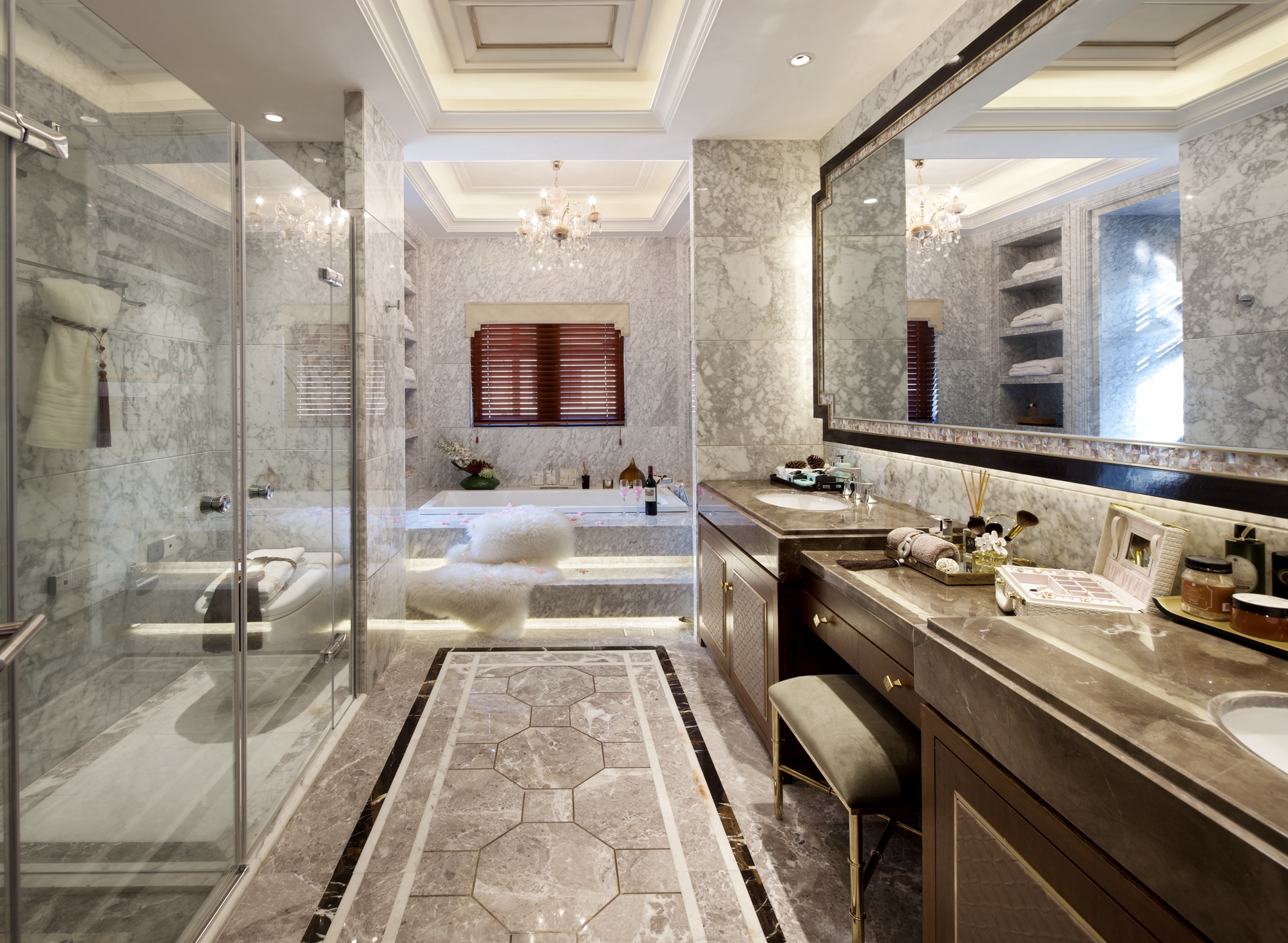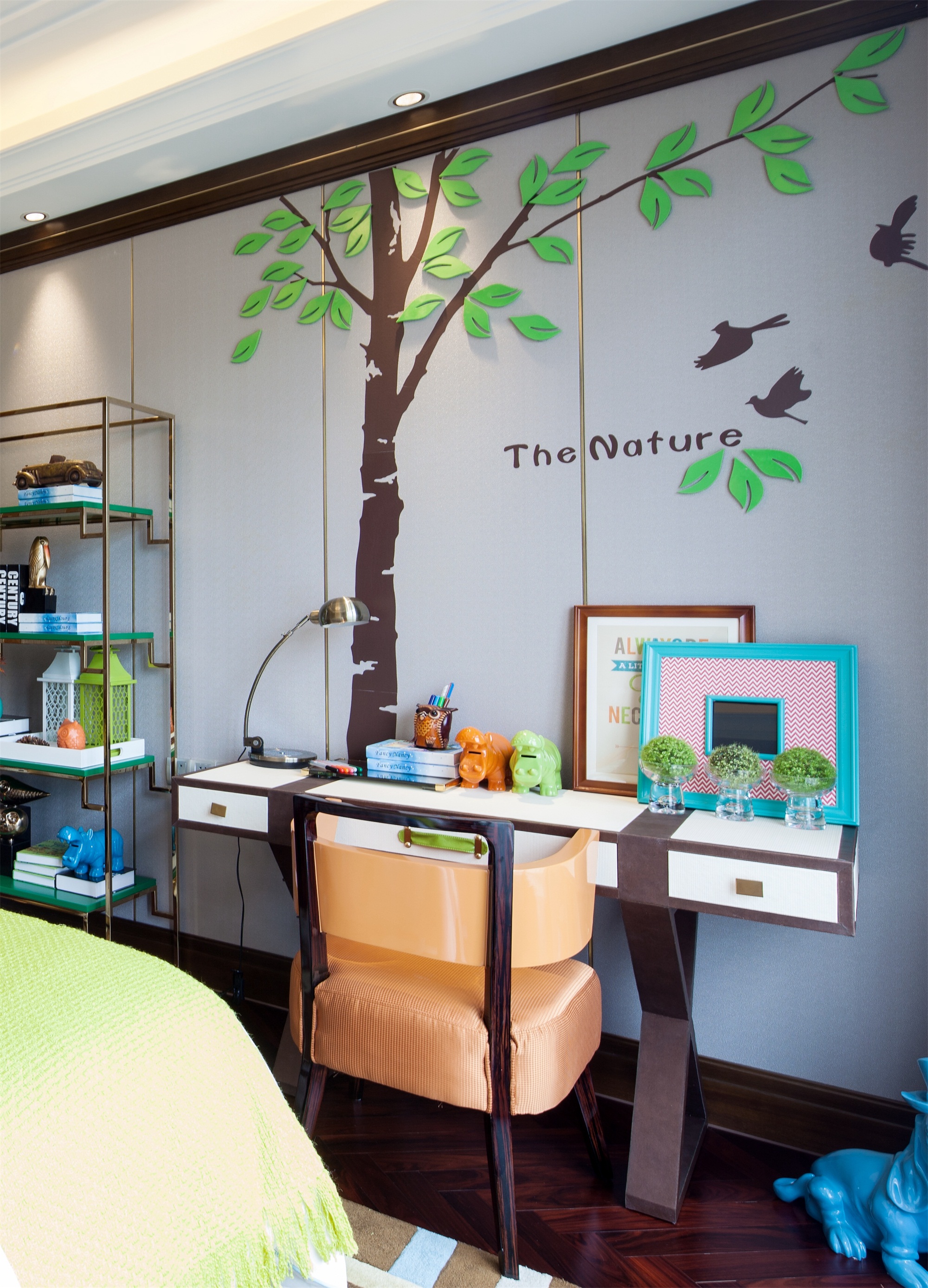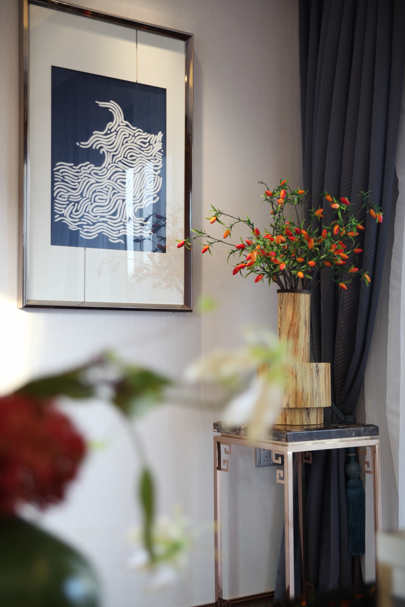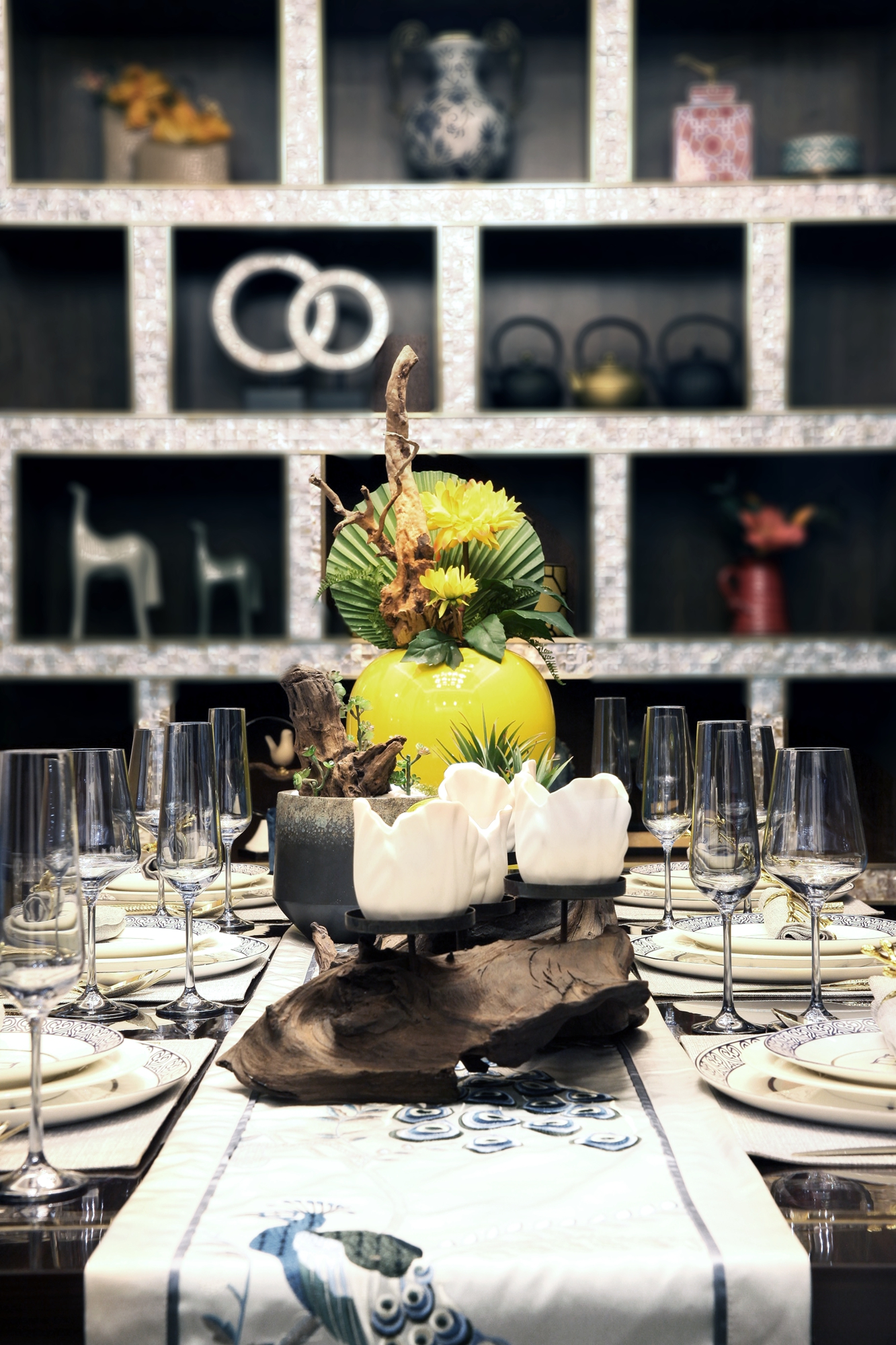 前言: 项目名称:重庆恒大御景半岛A4-4别墅 项目面积:425㎡ 完成时间:2015年 风格调性:简欧与中式混搭 软装设计:百搭园软装 在这套425平米的别墅中,设计师延续了巴渝文化中心的悠久历史与稀缺的文化风情,巧妙地将西式居住于中式现代相糅合,独具匠心,形成一座贵气优雅、别具内涵的住宅空间。整座别墅让生活习惯与精神文化的相结合,完美体现了传统信仰与优雅风情的气质交融。 整个空间以深咖啡色及大地色系为主,搭配大量的湖蓝色及亮黄色,让空间呈现出丰盈的层次感。中西方元素搭配,陈设品以陶瓷为主,再以恰到好处的绿植和花艺点缀,令整体环境优雅而又不乏生机。 走进客厅,似乎走进了东方的文化艺术馆。挑高层架构让整个客厅显得更加大气,湖蓝色的简欧沙发成为整个空间的色彩中心。随后,无论是抱枕上的牡丹花、高高低低的陶罐还是墙上的挂画,都以这个色彩进行延伸与呼应。除此之外,空间运用到了许多传统的中式元素,玄关的柜子上的青花、茶几上摆放着的麒麟摆件、主背景墙上分别用蓝色的梅花挂画与金色挂件配以黄色花饰,将自然与艺术相结合,让空间的东方美自然呈现。 餐厅延续了客厅湖蓝与亮黄的色彩搭配,白底青花图案的餐盘与金色的餐具搭配,朴实的东方情怀中透露着奢华与贵气,桌上的小绿植和木雕松果,让这样一个略显秩序感的就餐环境,多了几分轻松与亲切。餐厅入口处的两个立柜,后面的壁柜构成造景框,加上各种陶瓷及艺术品摆件,无疑是中式元素的最好代表。 在二楼的空间,设置有主人房、书房、小会议厅、健身室、棋牌室、客房等空间。而设计师顺应了别墅主人西式的生活习惯,并又热爱中式传统文化的信仰,采用简欧风格大床搭配具有弧形线条的沙发和简约的柜子,配上祥云的挂画、陶瓷摆件、水墨山画地毯表达出主人享受现代生活的乐趣的同时也追求传统文化。客房设计关照居者对生活广而大的需求,以欧式简约与现代中式的风格为基础环境,利用床上用品、挂件、柜地毯的色彩来实现不同区域的区分,呈现空间丰沛的美学力量。 书房当然也是充满书香和水墨的气息,传统的剪纸挂画、中式现代的案台、沿墙面而设的书柜以及山峦叠起的水画地毯……呈现极浓的书墨香。每个空间设计师都向生活和习惯找到生活真正的范本,并且从中吸收忠实于现代生活的语言,让居家的奢华元素凝练为匹配财富阶层应有的生活方式。
