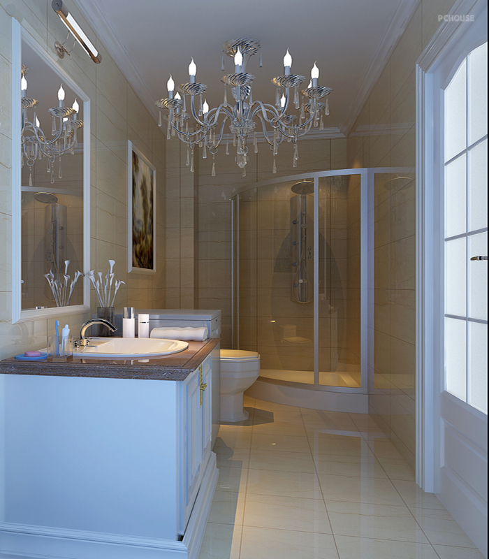 整个卫生间给人高雅别致的感觉,米黄的墙地砖及简洁的白色洁具处处显示着主人的品位与性格,高雅的水晶灯散发着淡淡的光源。从身体上和精神上给予主人最大的放松。整体简单但能彰显此设计的与众不同。