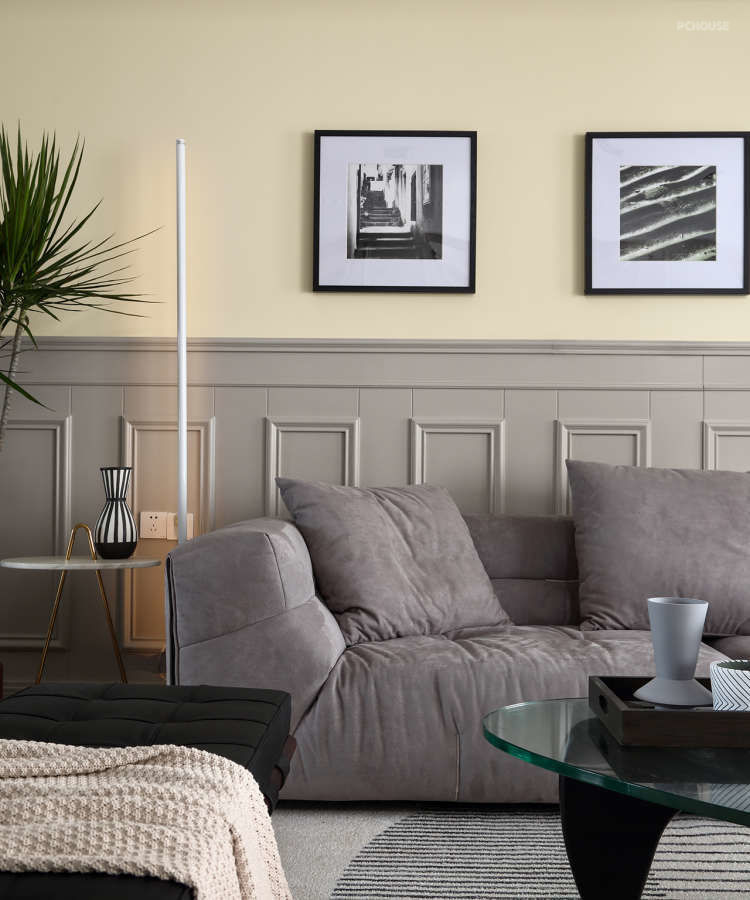 灰色半高护墙搭配奶黄墙面,从客餐厅延伸至走廊,设计感的家具映衬线条图案大地毯
