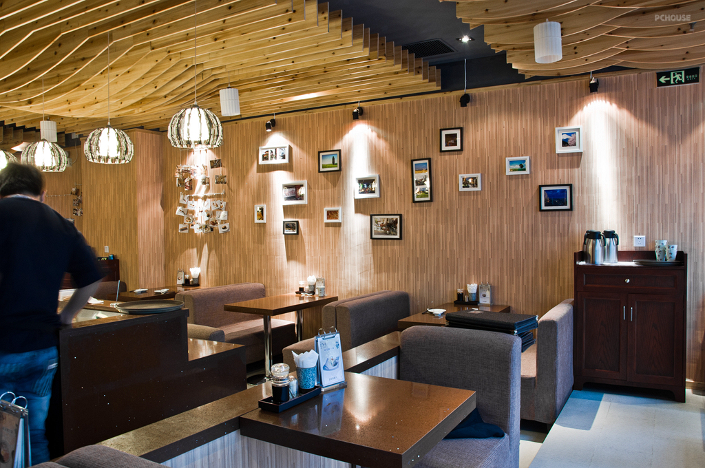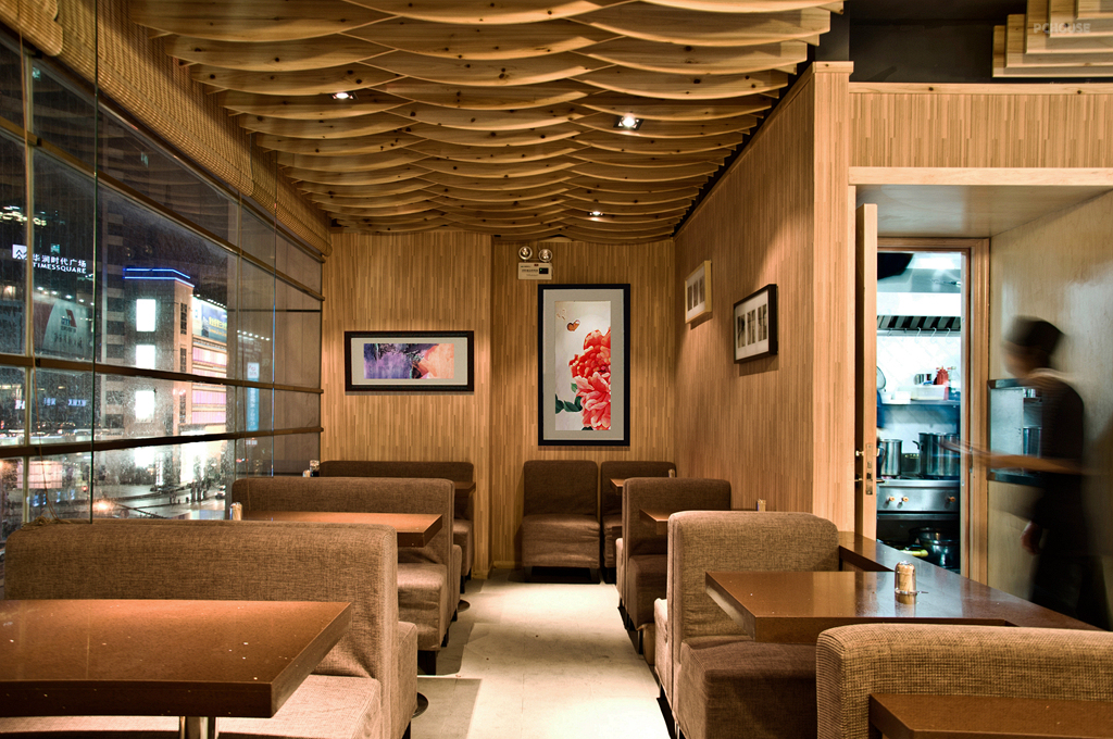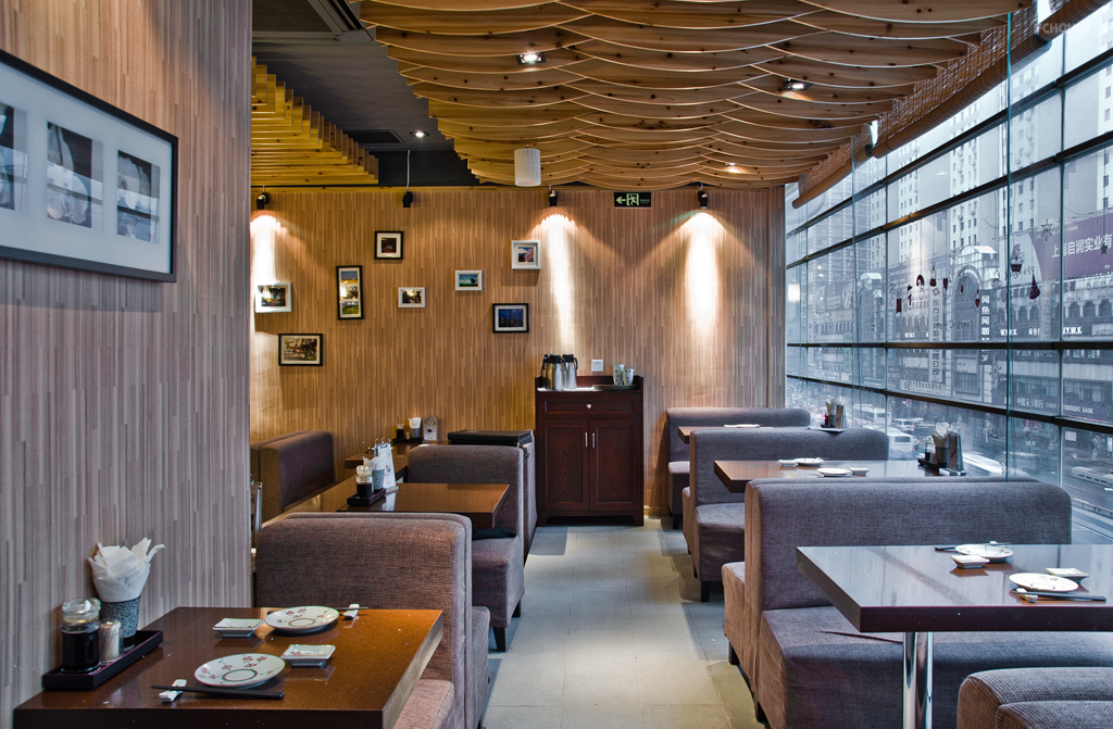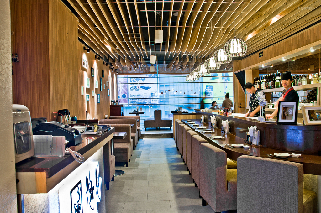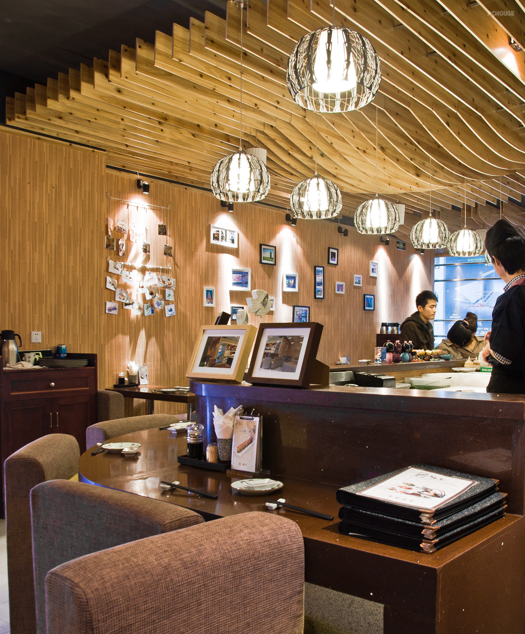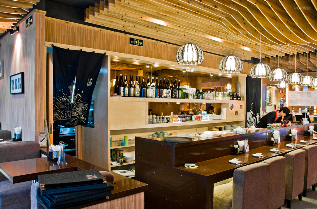 前言: 自然、原生态的设计用料。材料均为自然环保,并且经过精细计算,不浪费分毫材质,灯光采用节能型灯具,低碳环保节能的概念充分考虑。墙面充满肌理感的木纹墙纸个性而不失温馨,天花的流线波浪设计充满动感,设计灵感来源于鱼的外形轮廓,透过玻璃可以起到吸引食客的好奇心理;入口玄关的饰品利用枯枝、藤球、鸟笼、花艺等创造出自然的氛围,颇有“筑巢引凤”的寓意深藏其中,尽情表现日式的枯山水文化;墙面的装饰画采用或黑白或低彩度的题材来点缀空间。整个空间动线流畅,没有太多多余的装饰,简约而不失时尚。