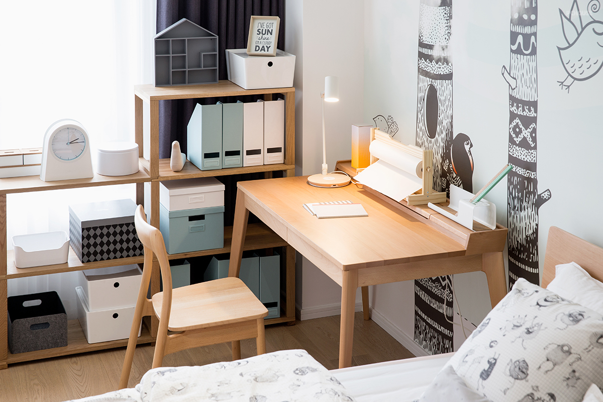 卧室是精神放松之处,原木色家具令人感觉自然、亲和、轻松,搭配素色的棉麻家纺,整体的中性色则让卧室显得简约、优雅。窗帘的选择上建议挑选遮光效果好的厚窗帘搭配白色窗纱。