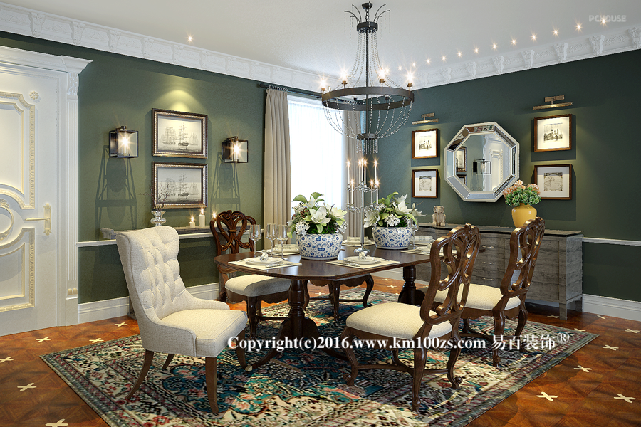 前言: 本案在装修风格上追求一种自然的美,整体设计兼具古典主义的优美造型与现代主义的功能配套,既富有历史感,又温暖舒适。 客厅作为待客区域,使用大量的木饰面装饰,达到古朴自然的装饰效果;再加上各种仿古艺术品的放置以及各种仿古墙地砖的铺贴,都是对美式风格的完美诠释; 设计师将古典风范与个人的独特风格和现代精神结和起来,使整个餐厅呈现出多姿多彩的面貌。 无论是餐桌上华丽的枫木滚边,枫木或胡桃木的镶嵌线,以及模仿动物形状的椅子腿脚造型,无不体现着优雅的雕刻和舒适的设计。