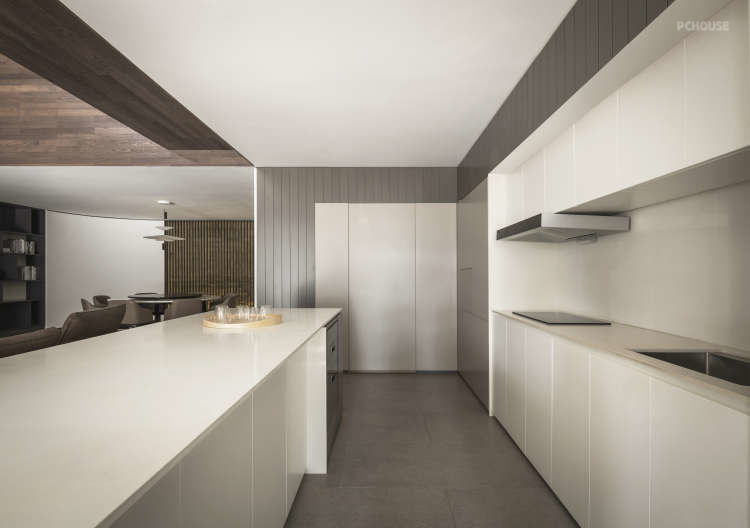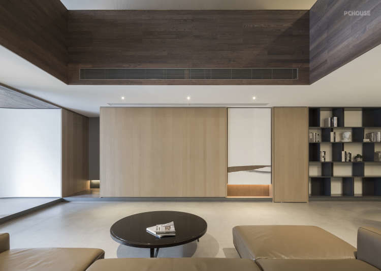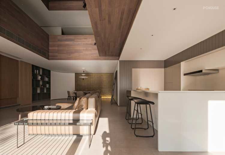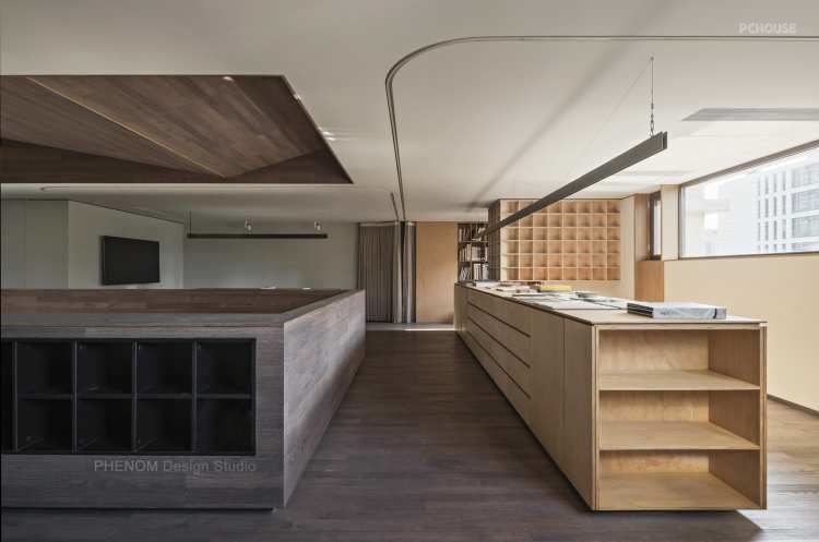 一楼设置了室内园景、书柜、西厨及吧台,也设置了长沙发及圆形餐桌,我们希望用一个轻松的环境去了解客户的需求或者在这里用一个下午茶的时间进行设计师之间的交流。