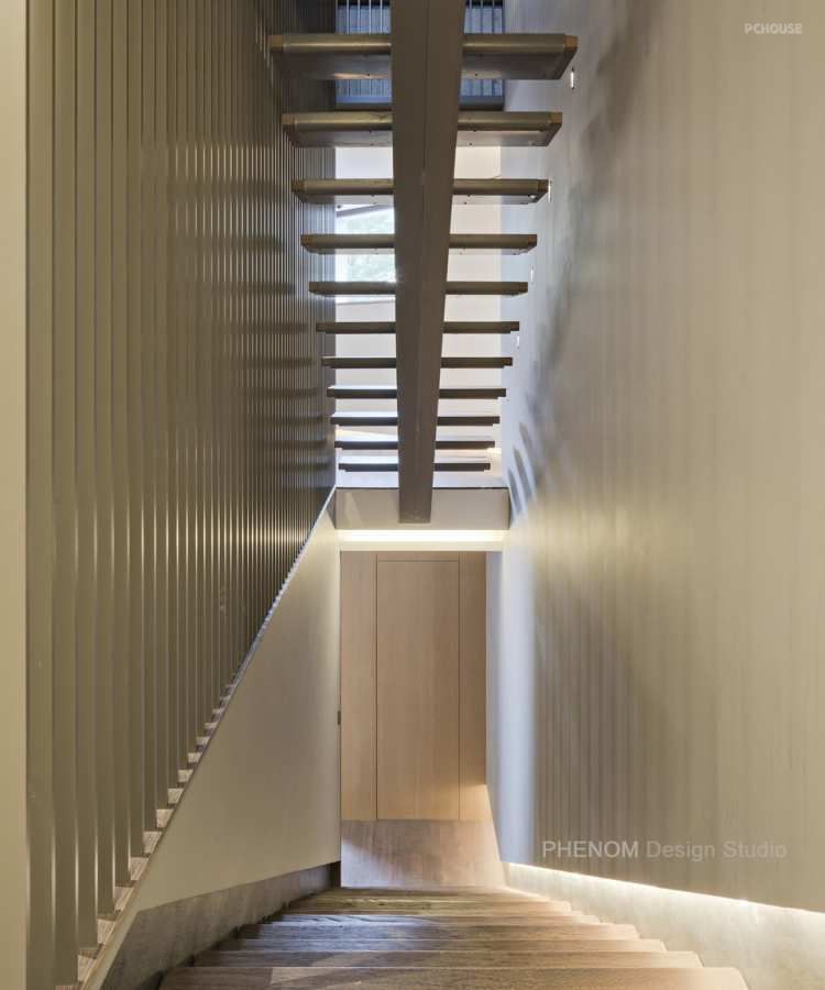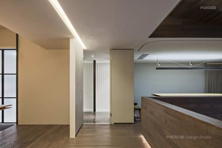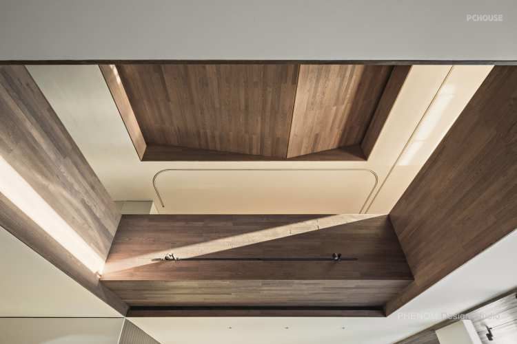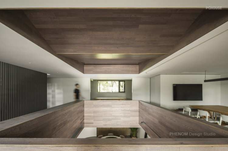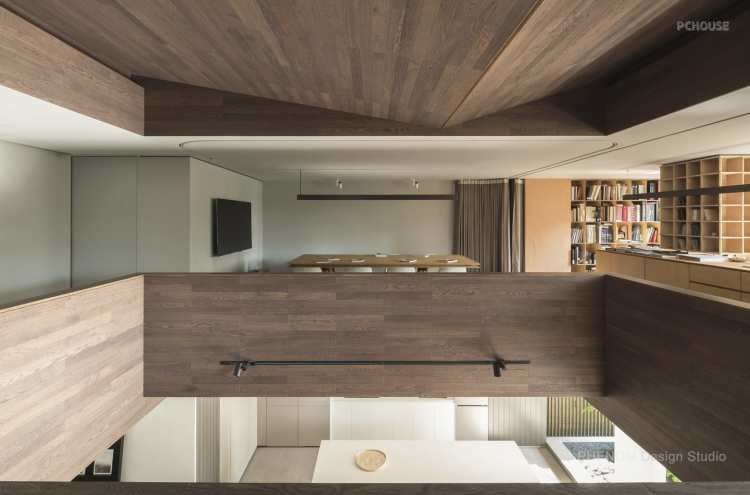 由于加建后的二层层高只有2.2米,我们在二层的中央做了个大中空与一楼贯通,缓和了二层天花低而产生的压迫感。