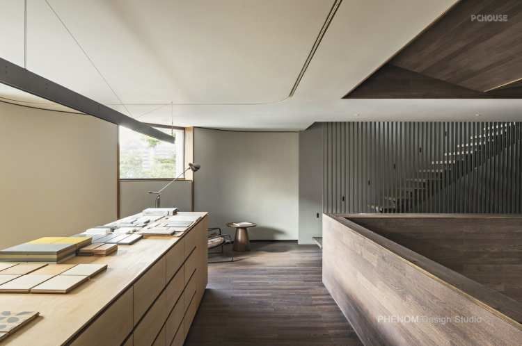 二楼是我们工作所需要的功能区,会议室、材料柜、资料架、都集中在二层。功能在单独使用的时候用布帘来分隔,平时会是一个全开放的状态。