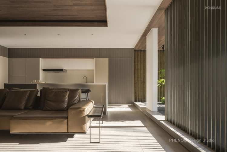 一楼的主入口和窗户都在西面,为了避免阳光西射所产生的闷热又保留光线,我们将入口内退3米形成遮阳,而大落地窗的区域设置了室内园景作为与内部空间的分隔。