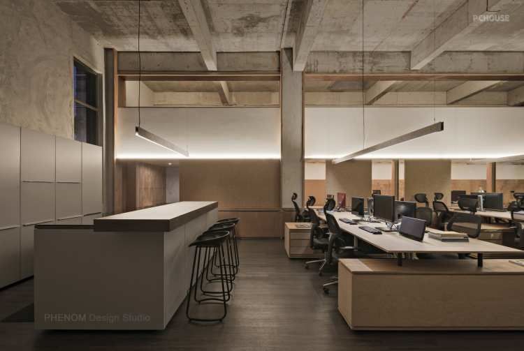 办公台、会议台、材料柜等大部分办公家具和长条形的不锈钢吊灯,都是由团队成员亲手设计、制作并完成最终的安装,我们每天都享受着、触摸着我们一起制作的成果。