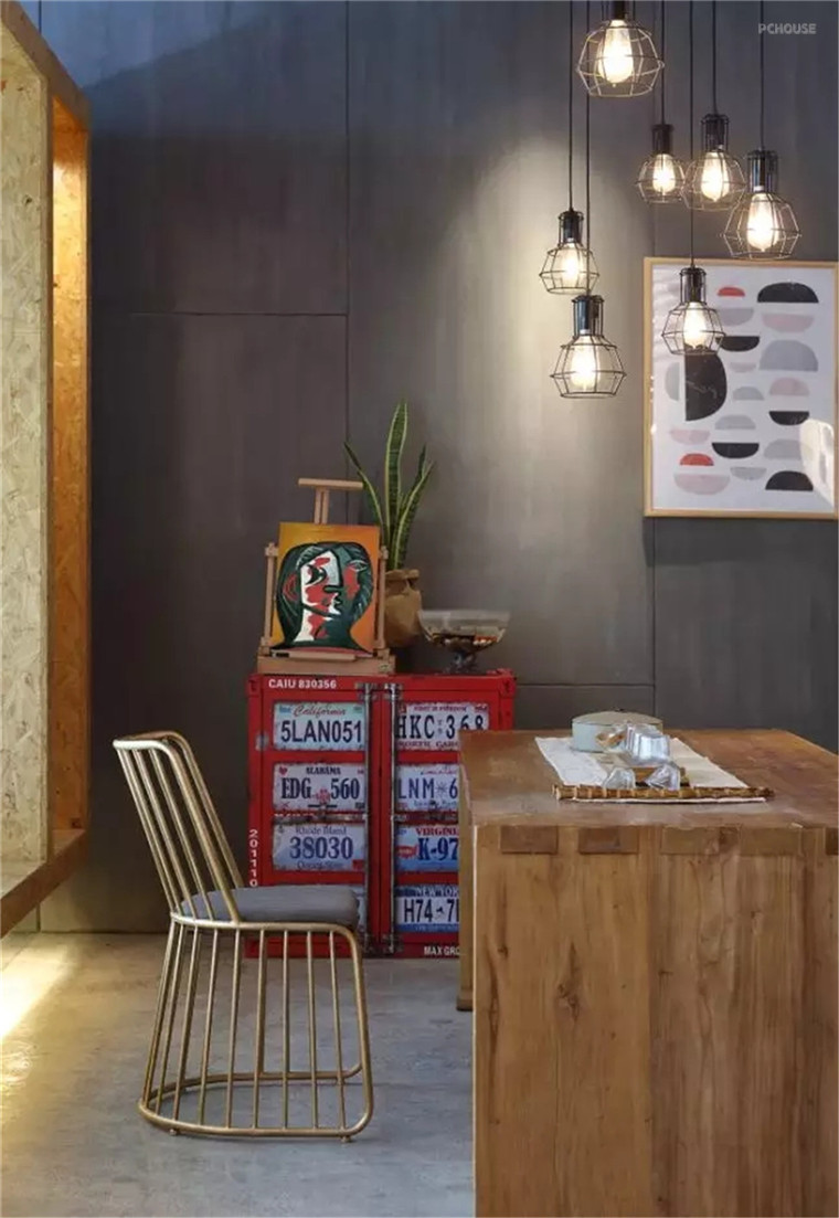 工业风格设计有一个很大的特色就是墙面。单调的粉刷墙看起来仿佛花的心思不大,其实却是隐藏着巨大的艺术空间,散发着粗犷、神秘的特质。灰色背景,配上他们自己设计的logo,再用一束光打过来,这样很有不一样的视觉体验。