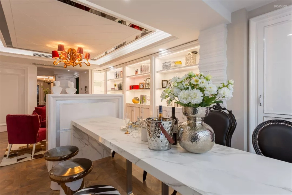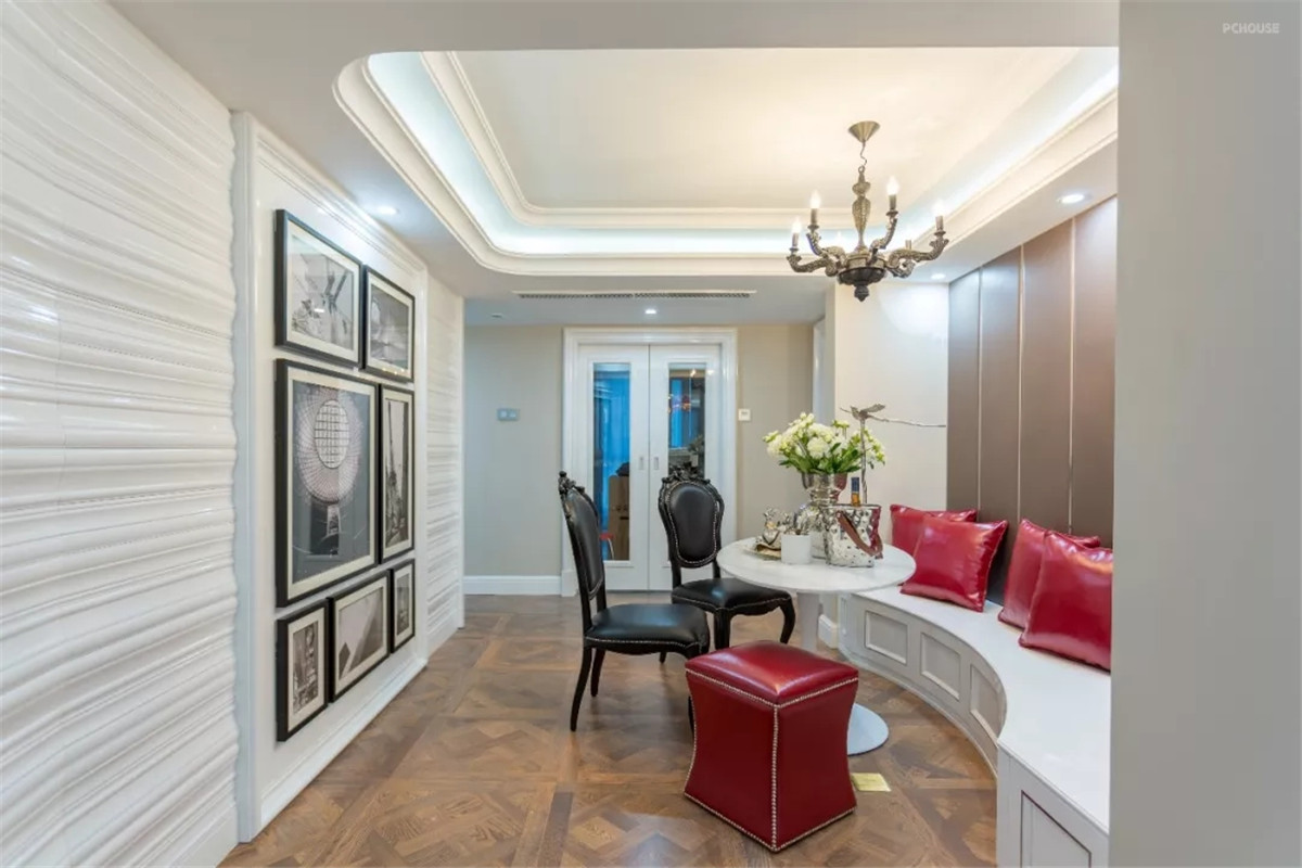 设计师首先将玄关处的墙体设计成弧面,让空间圆滑流畅,空间感up up up;连通客厅与卧室的门廊之间,设计师做出一个小餐厅