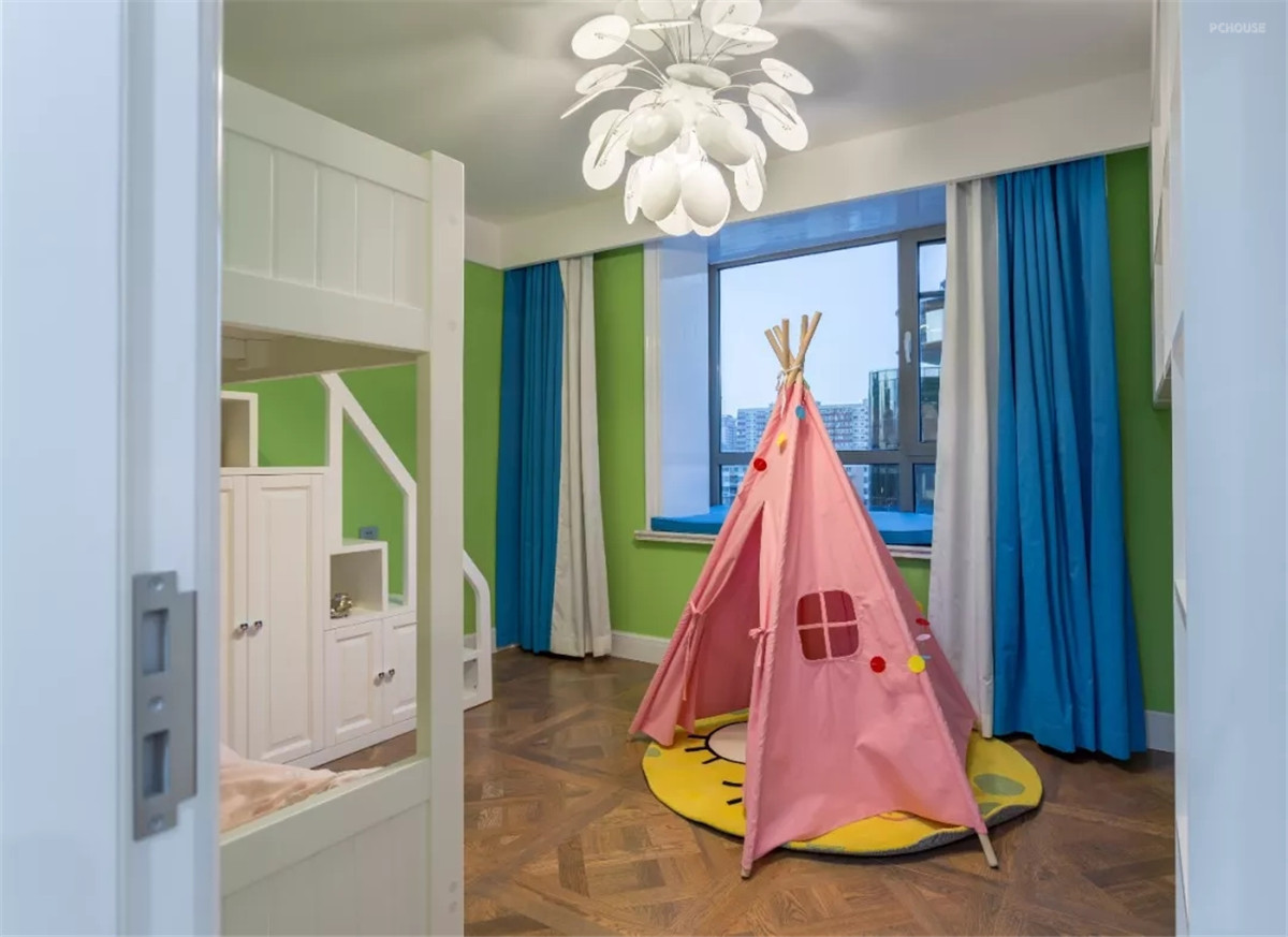儿童房的空间有限,但为人父母都希望孩子能有足够有趣的、快乐成长的空间,适当选择的大色块,有利于刺激儿童视力的发育。