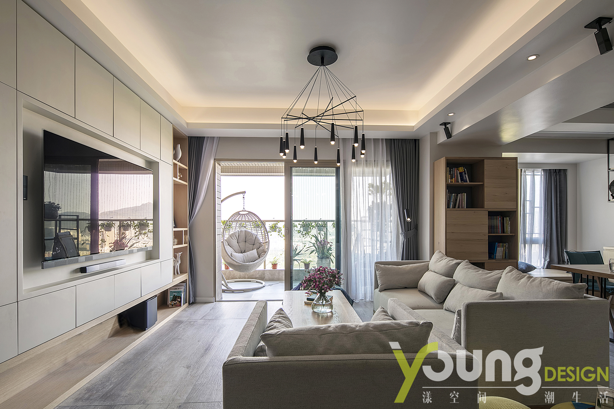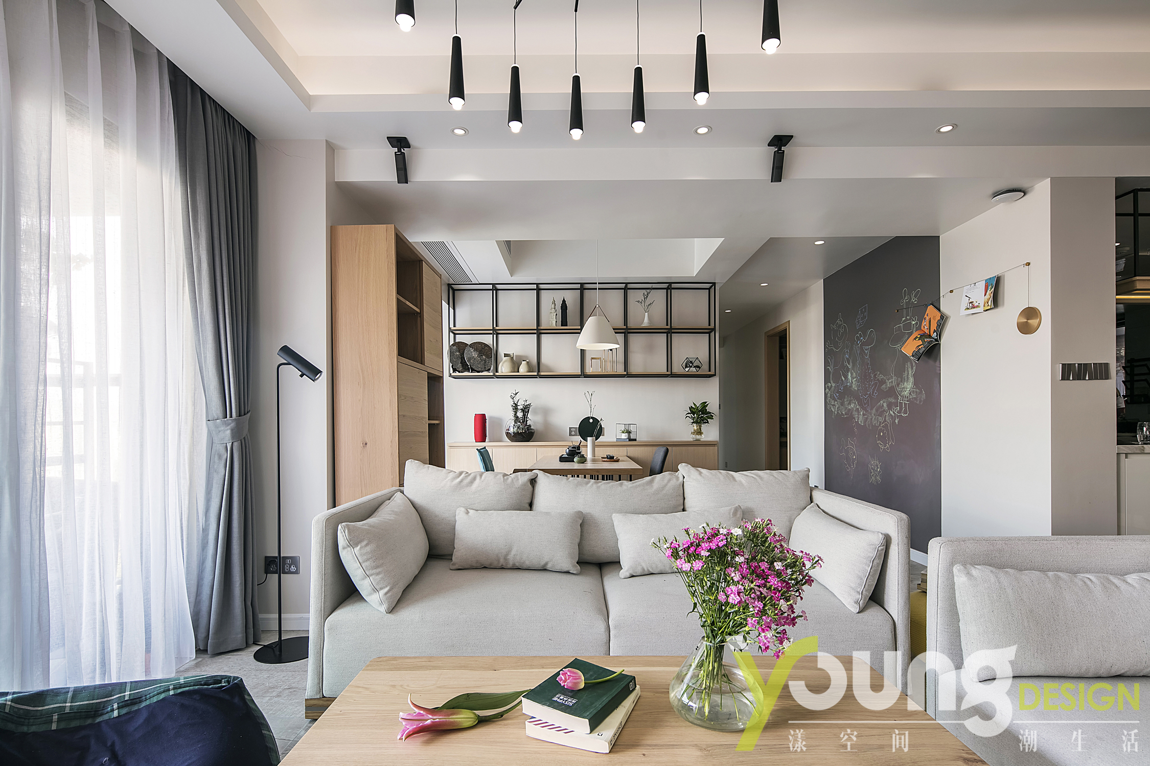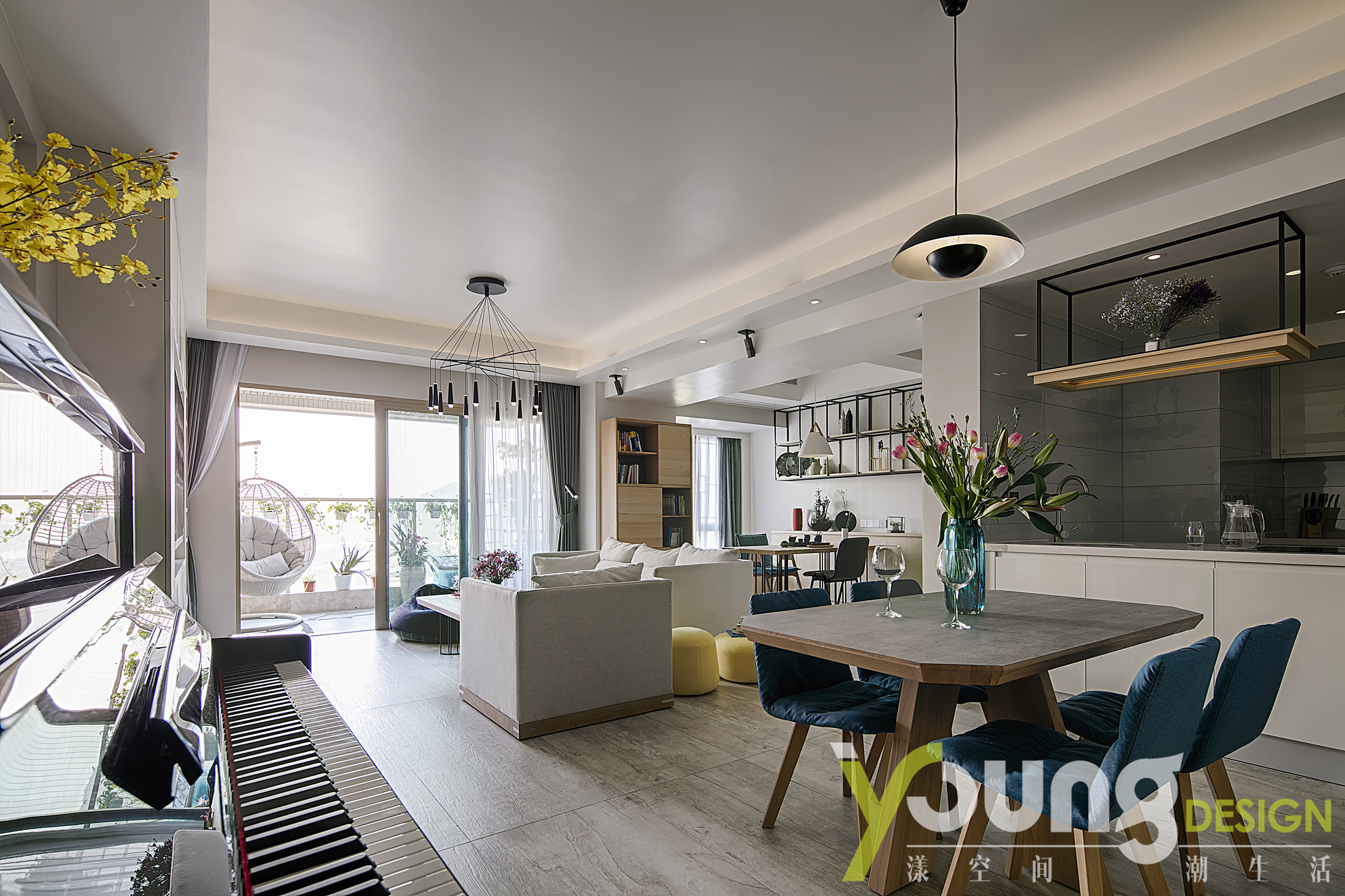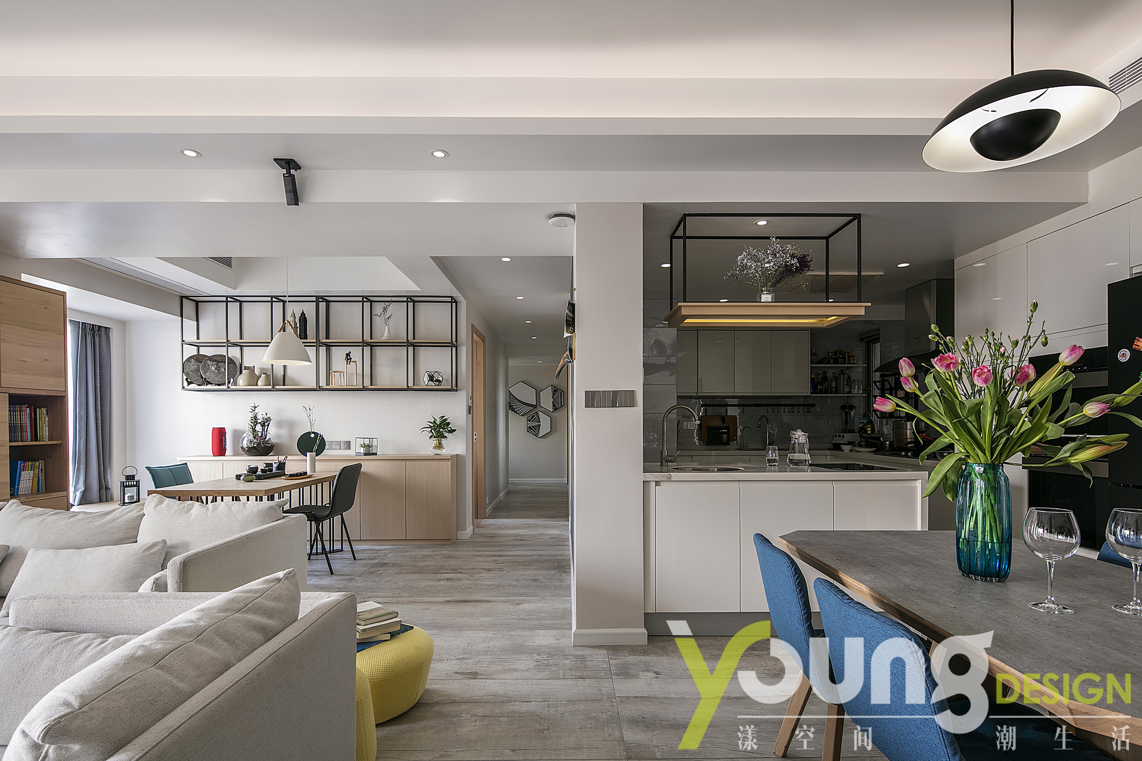 客厅、餐厅、书房和厨房之间都是没有完全隔断的,四合一的大胆设计,尽可能的利用到了边际空间,使整个空间宽敞透亮!没有隔断的空间设计无形中也促进了家人之间的交流、拉近了彼此的距离。