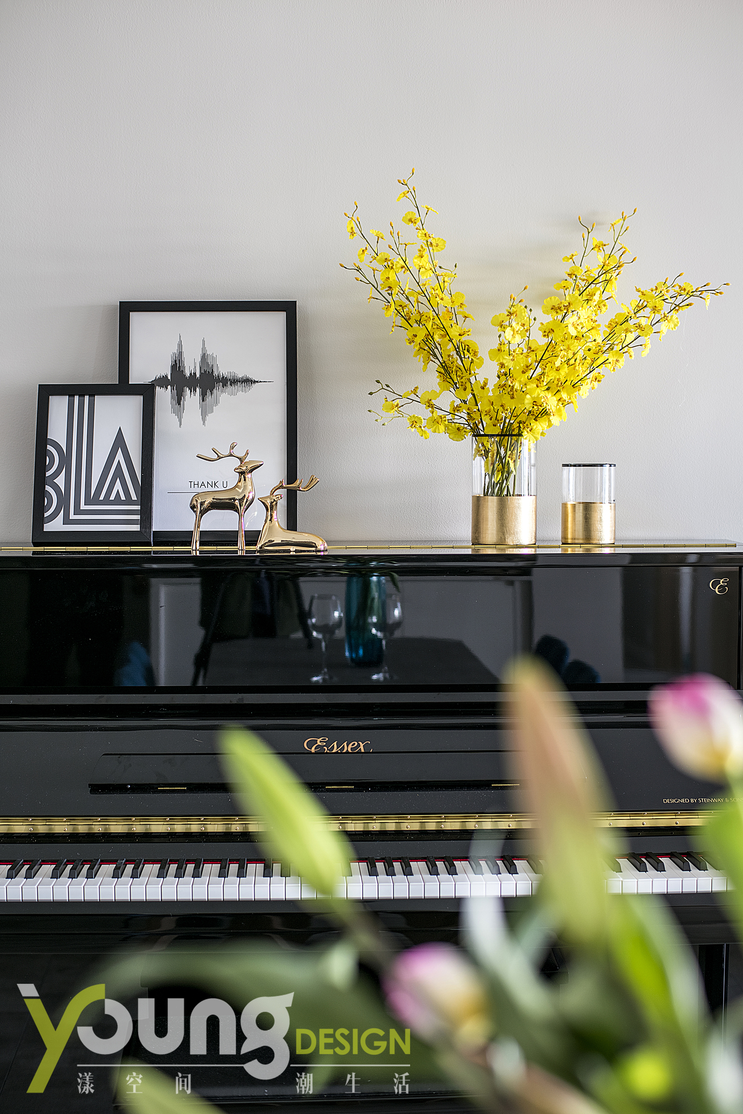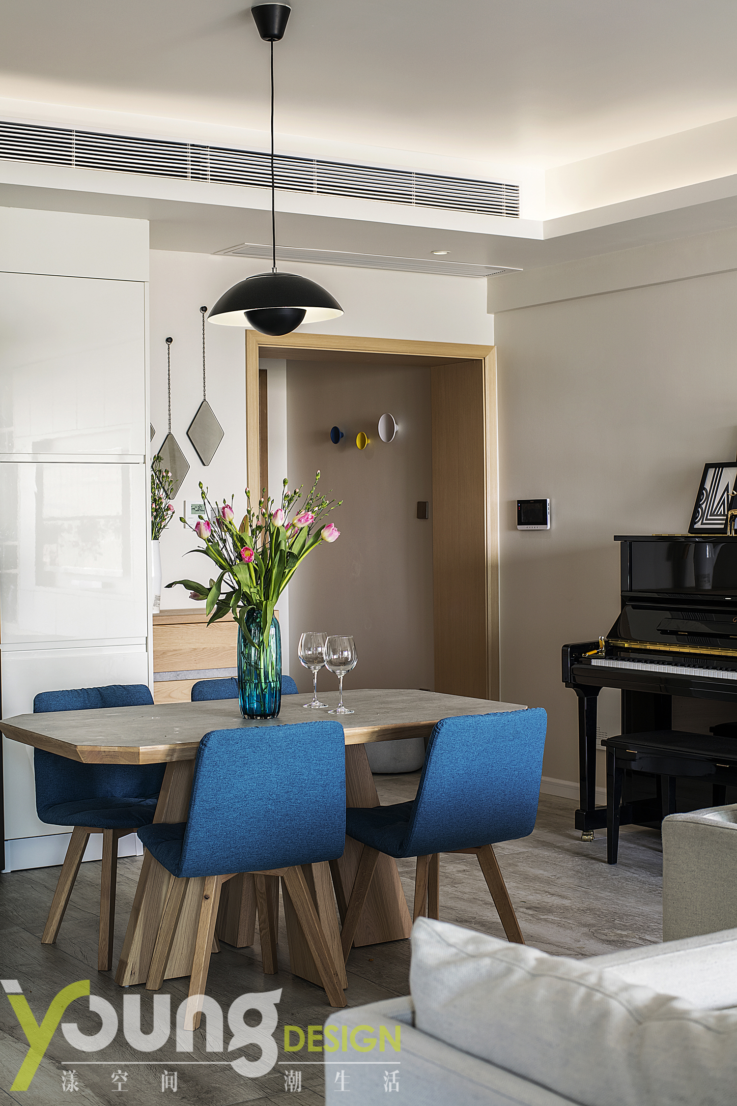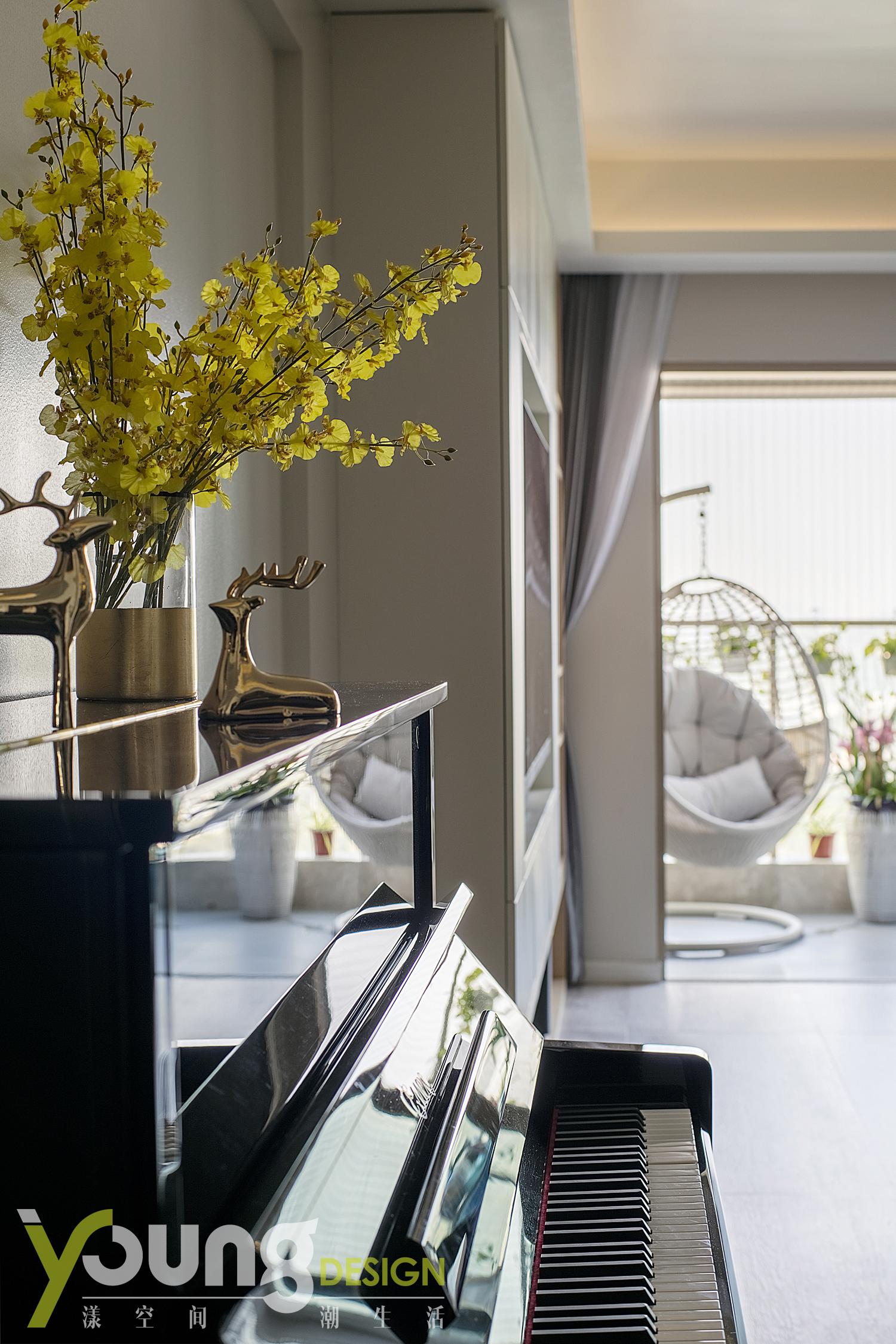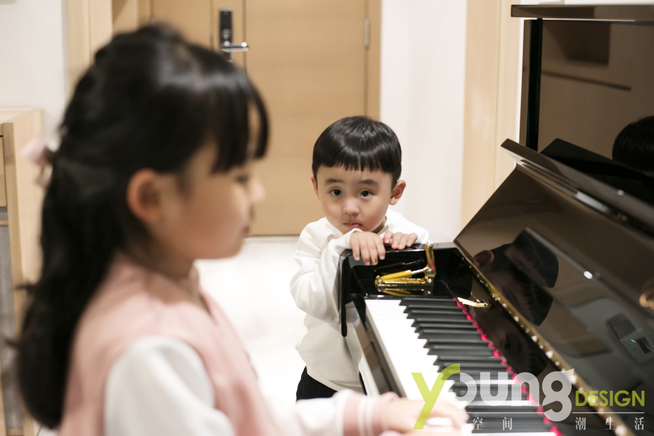 入门通道旁放置着孩子的钢琴,使小朋友拥有了相对独立的一方天地,可以尽情享受欢乐时光。