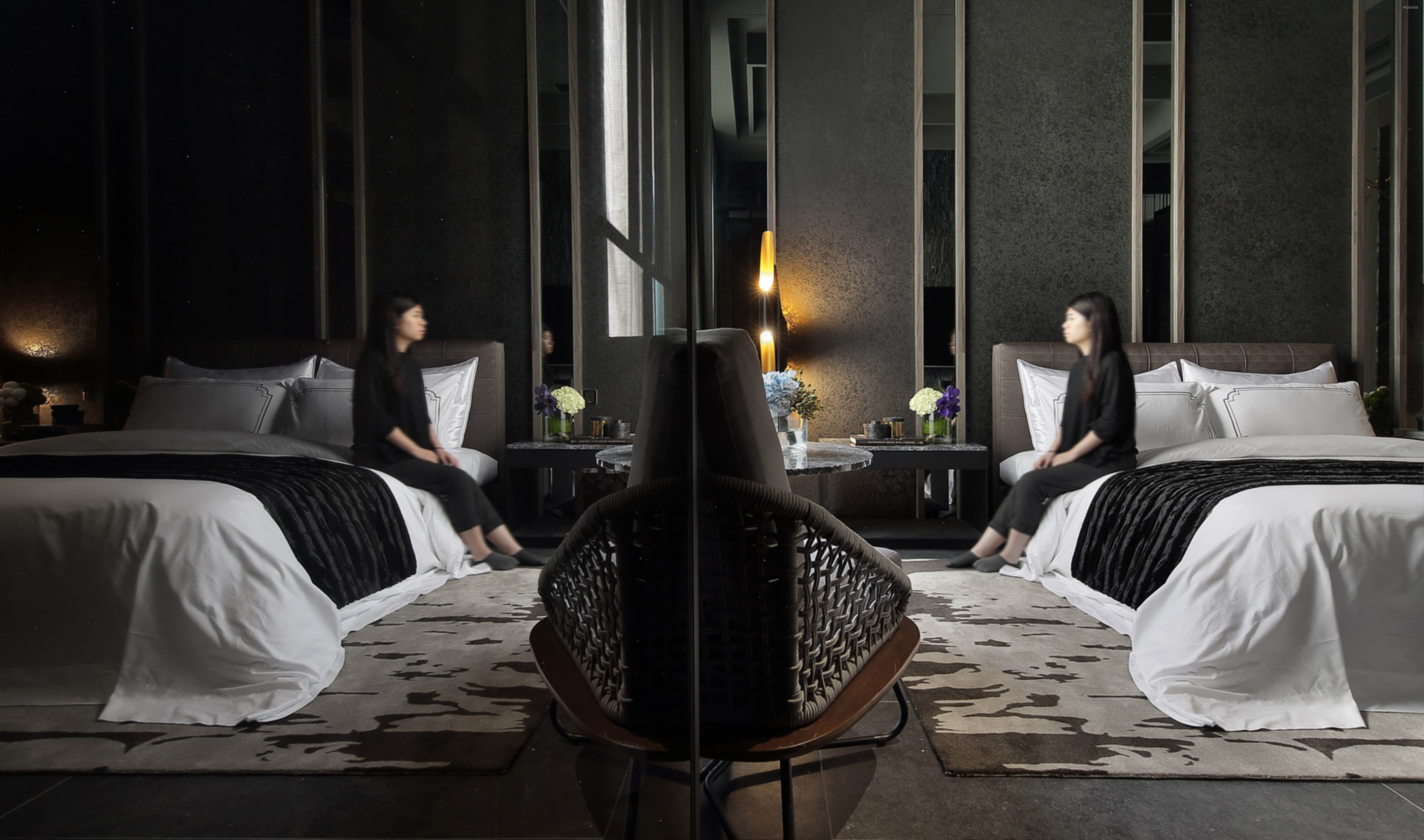 前言: 空间中灰色底墙,忧思浅浅,恬静且安然, 发丝般金属屏风一体两用, 散置于空间天花板或排列于地板界定空间场域, 让水平景深藉由虚实错位屏风可沁于后方。 空间呈田字型平面以不断平面不断视野原则, 运用屏风自由开阖兼具私密与开放。 庭院水波纡缓,绿意清翠,豁朗且清亮, 借此鲜明的灰、绿色调对比及场域变化涵养空间层次, 二者赋予酒店空间澹美生活观。