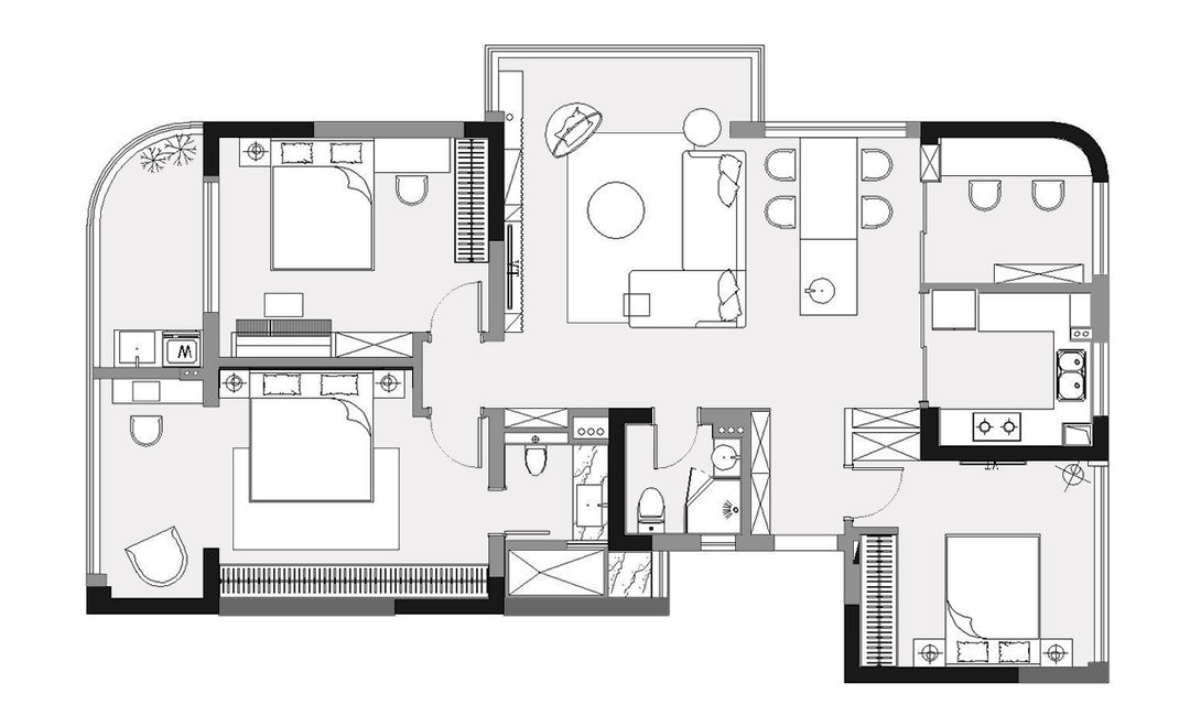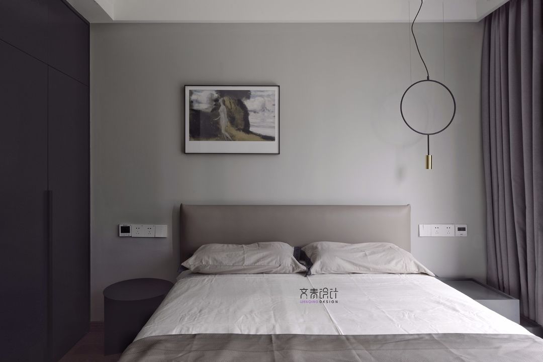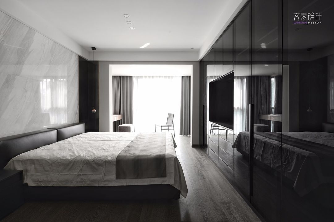 本案建筑面积129方,平面布局保留了原有的4个房间,设计师通过线、面比例以及材质的运用,营造极强的空间感和质感。原有的客厅阳台宽度较窄没有太大实用意义,将之拆除后内包,将客厅背景墙延展至此,成为客厅的延伸空间。
