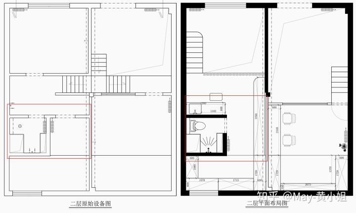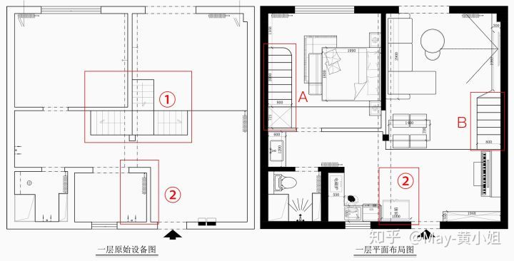 ①原始布局中,楼梯处于户型中间位置,正对入户门,整体空间比较压抑。且楼梯和二层空间占用的里面空间较大,导致房间里面采光昏暗。