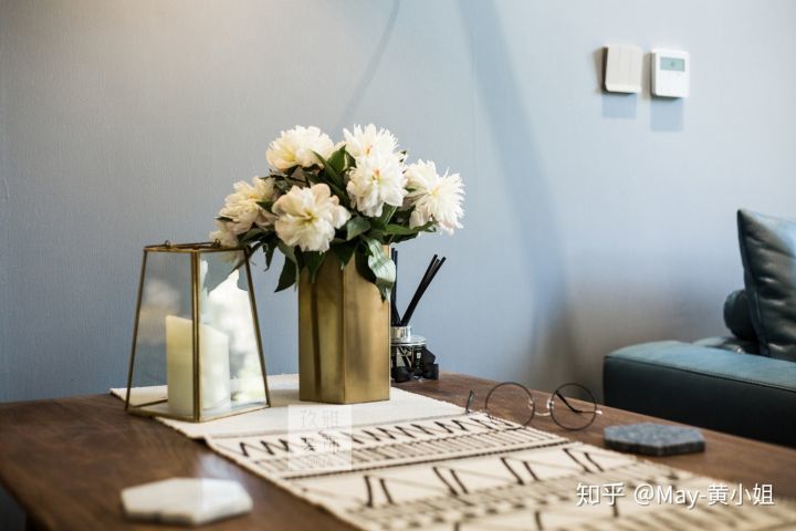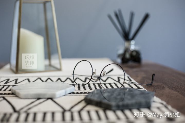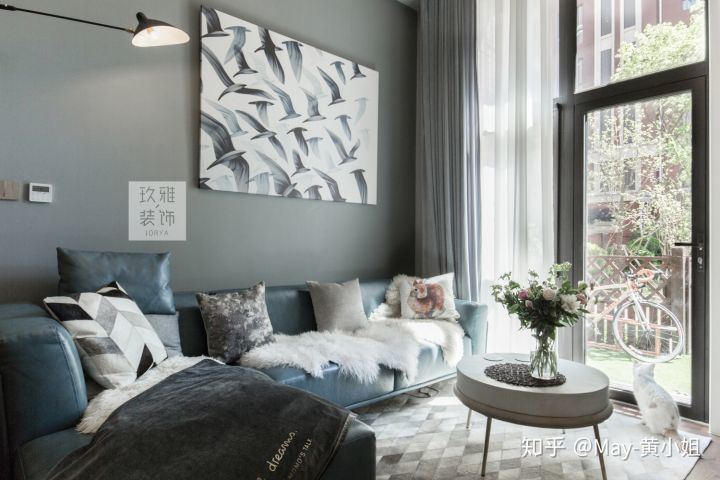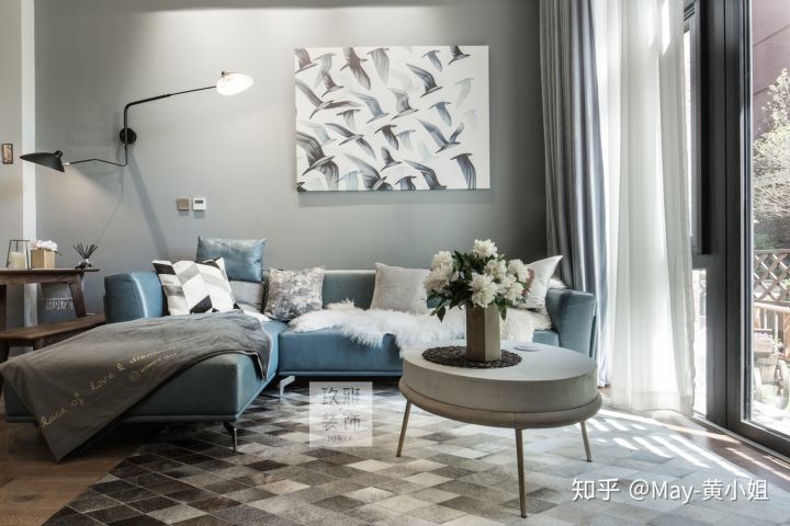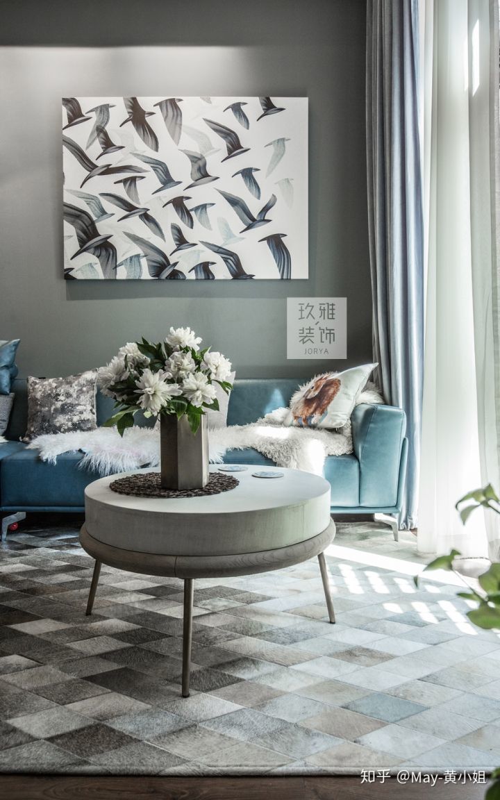 ▲装饰画的风格与地毯的形状相呼应。主体沙发没有选择常规的深黑色或者深灰色,而是选择了灰蓝色,使之从整体灰调的空间里跳出来,显得空间层次分明。