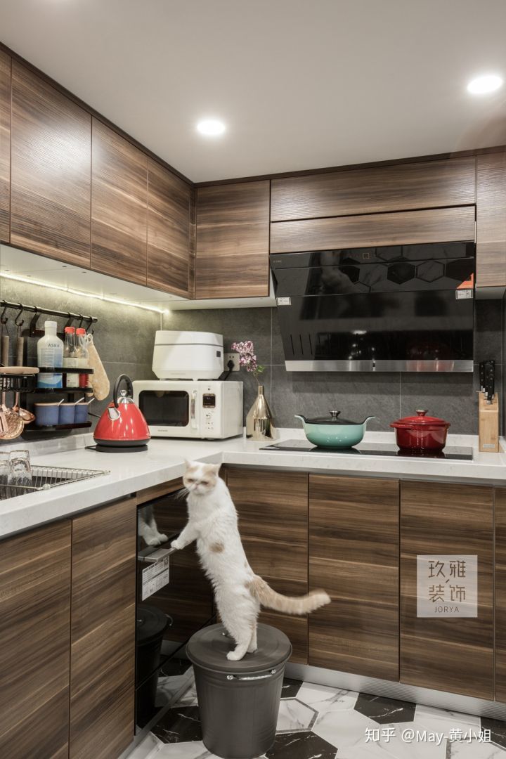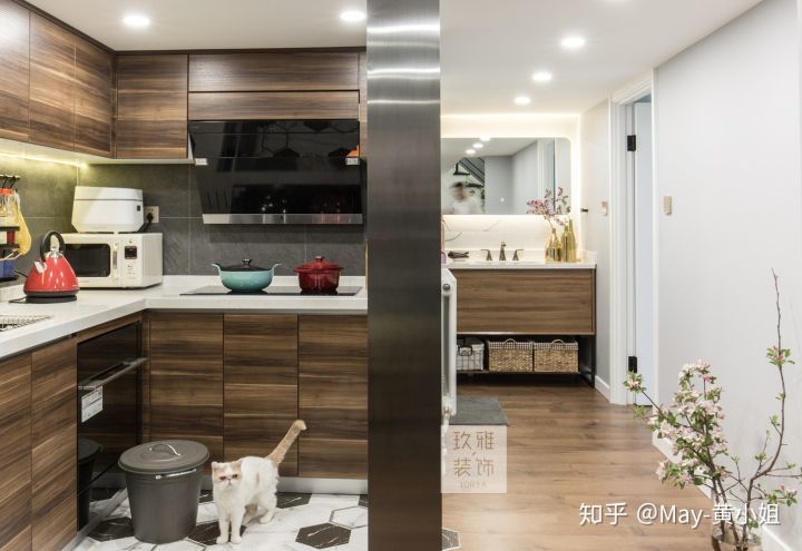 ②拆除原始墙体,将厨房设计成开放式,提高空间使用率,增加了一层空间的采光通风。