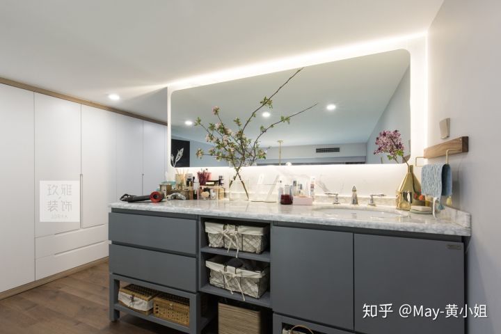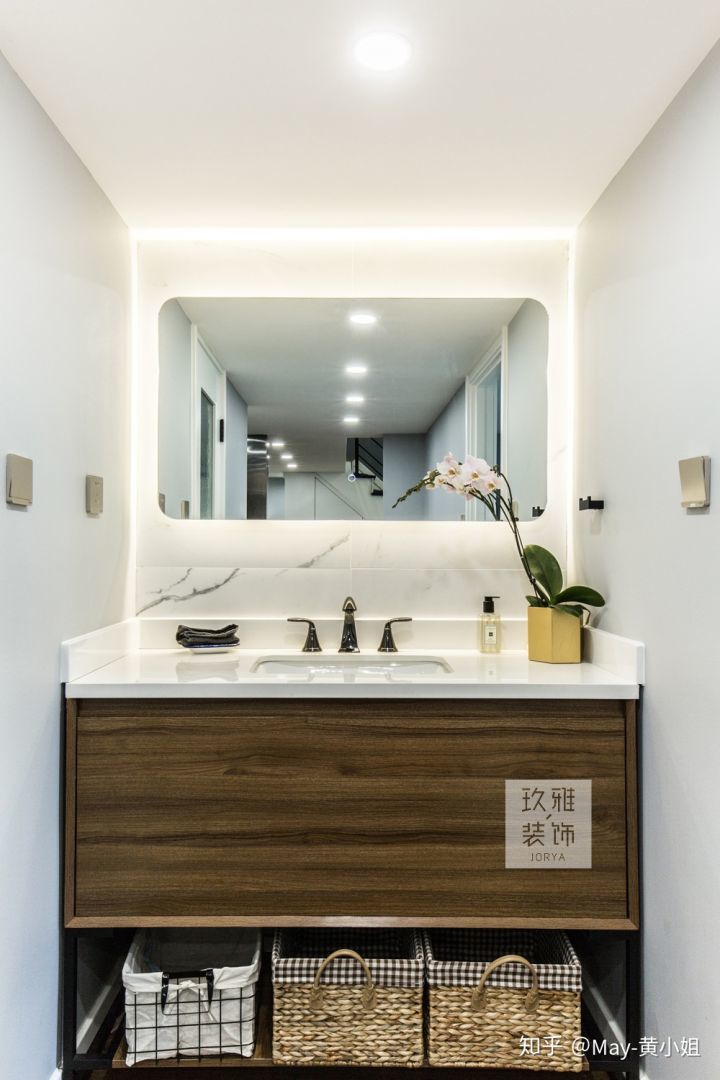 ▲一楼卫生间也有洗漱区域,因此二层洗漱台采用大单盆,左侧则作为女主人的梳妆区。镜面后同样设置隐藏光源,让光线自然均匀。浴室柜下方设计方便使用的储物空间。