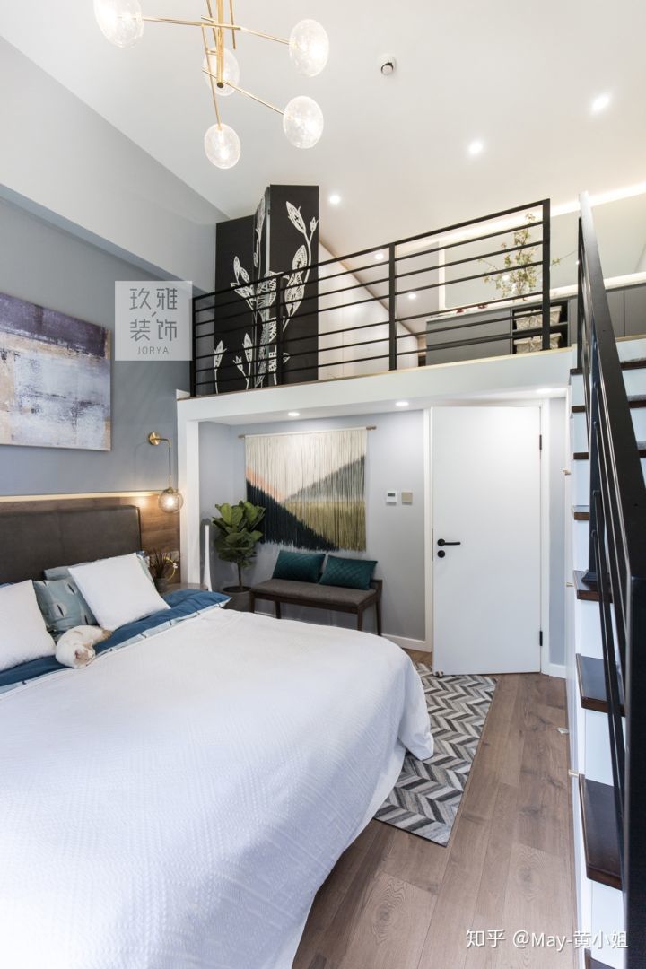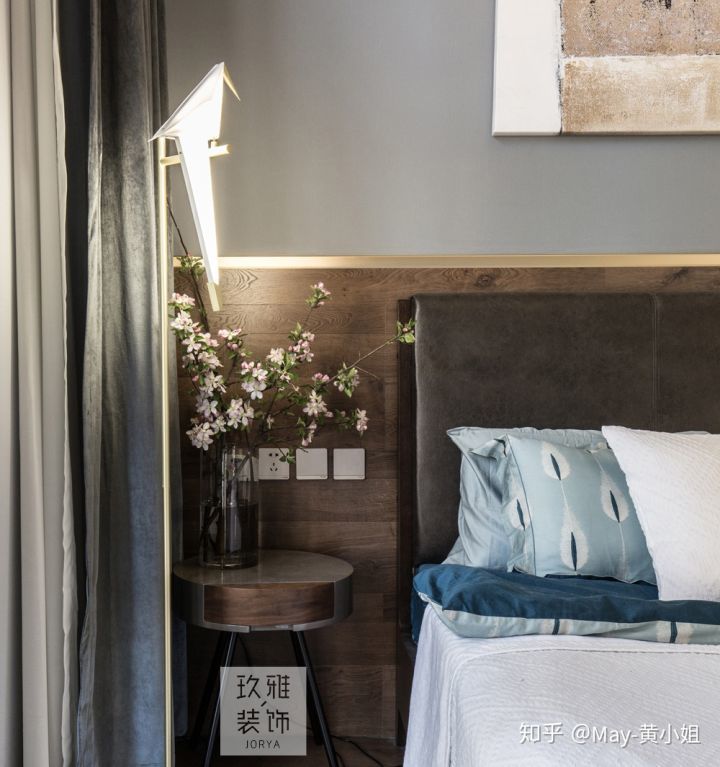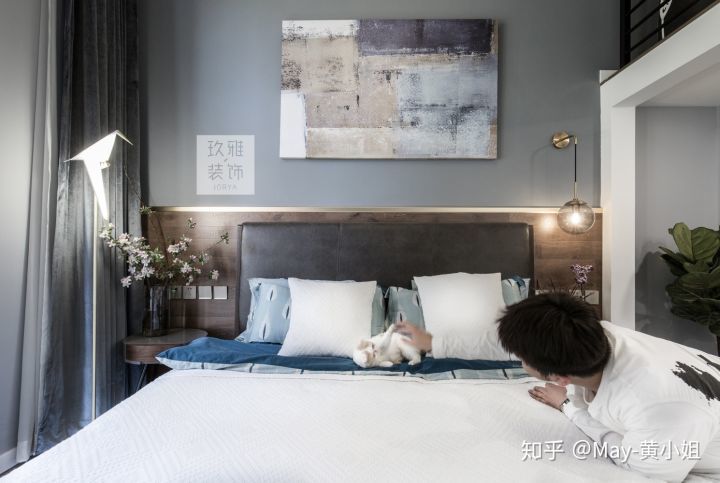 ▲和猫主子互动的设计师。卧室采用了单边吊灯,一侧落地灯的形式。