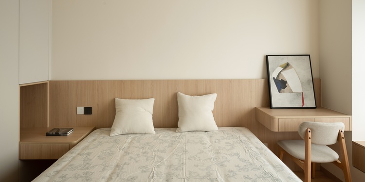 卧室墙面不似客厅的暖米色,而是选用了米白色;地面也铺满沉稳温润的木色地板,搭配上蓝绿色的床品,瞬间注入浪漫的基调;床头用蓝白对比色也烘托出满室的温馨优雅。