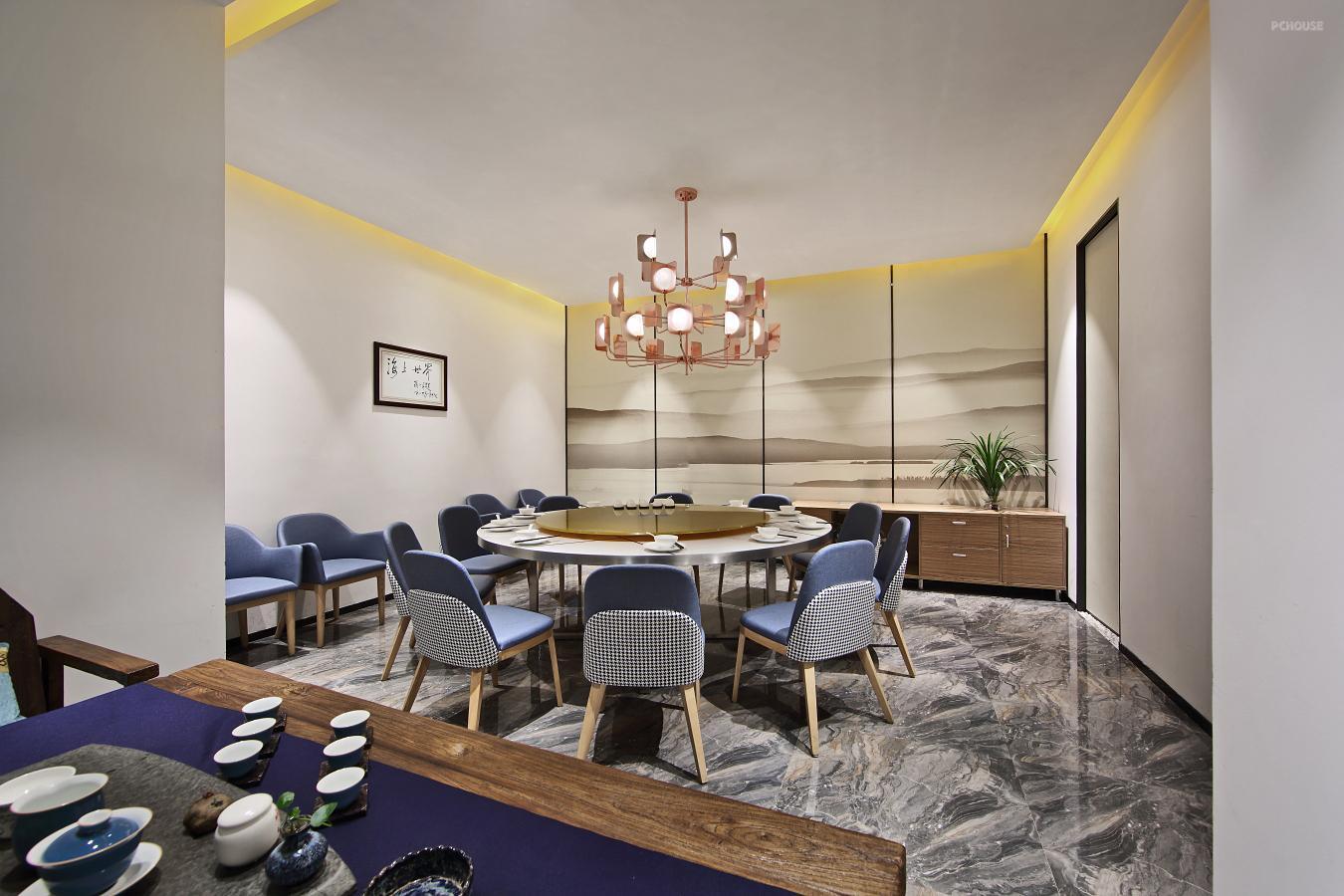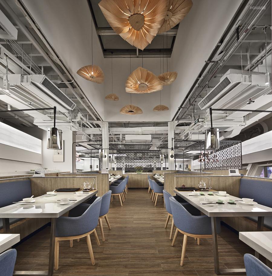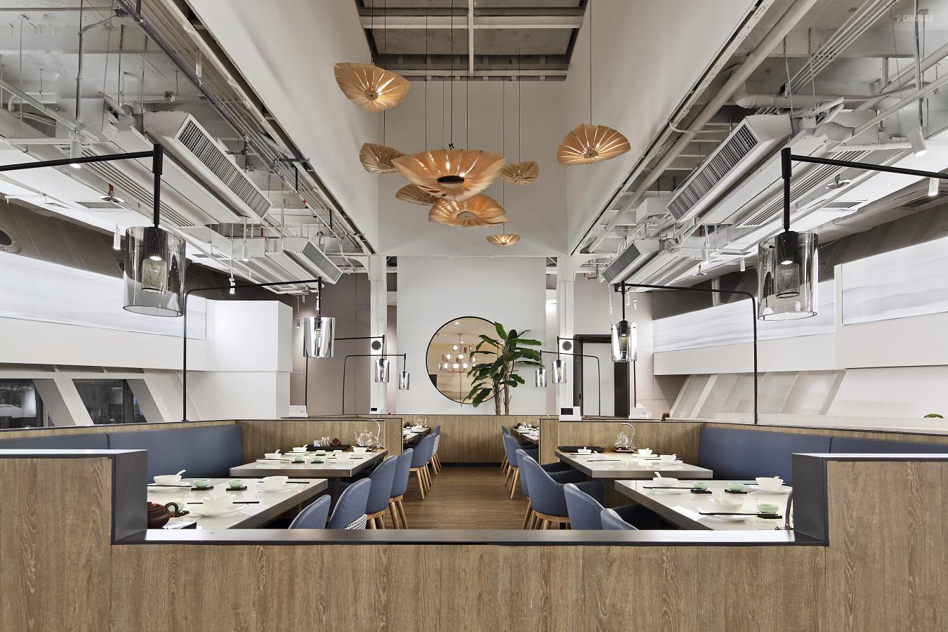 前言: 「饮左茶未?」是传统广东人的招呼方式。叹茶,是一种关于享受的符号,一种休闲生活方式。位于深圳旅游地标——海上世界明华游轮上的船说餐厅,致力打造成一家以广式茶点为主打的轻奢休闲餐饮品牌。 在空间演绎上,艺鼎设计师借鉴中式庭院概念,一步一景、远高近底的层级排布空间,借用水系绿化带作为空间分割媒介,营造一个休闲舒适、如诗如画的用餐空间。门面设计以简约为尚,闲闲着笔,勾画游刃有余的自在意境。青阶白墙,山水纹氤氲缱绻,将海洋的韵致晕染开来。墙壁内嵌入的精巧景观,虚实相生,藏纳天地之灵气。 设计师将传统与现代文化交融作为手法,去除传统中式的繁复细节,保留并升华神韵和气质,使之呈现时尚现代感,氛围中又低调显露新中式的魅力。 设计师充分利用了海上的自然风光,雅致的海蓝色穿插于空间,使室外景色与室内相互交融。搭配自然原木材质,从感官的喧嚣回归到朴实无华,打造出洋溢人文气息的就餐空间。 中国窗花元素的镂空雕刻钢板,对空间进行有层次的遮挡与半通透,多层模糊的视觉叠加,制作了陌生而有趣的气氛,同时保持区块之间的朦胧联系,为空间增添几分灵性。 古典园林元素中圆月窗洞的创新演绎,使景中有画,画中有景,两者相得益彰,形成良好的视觉中心点。传统文化经过岁月的洗礼,仍旧在静谧中散发出迷人的魅力。 框景的设计手法,得以让人窥见包房气质韵成的情浓境深。山水墙画与墨纹大理石地砖,铺陈出一幅悠然的山水画卷。一方茶桌,一隅宁静,在此叹茶点,品清茶,感受东方精神气质的自然流露。 真正的享受,是一种内化了的心之所求,不张扬,却动人心扉。让我们走进船说的故事,在文化的风景中,迎着海风散步,寻找一个时代的韵味与诗意......