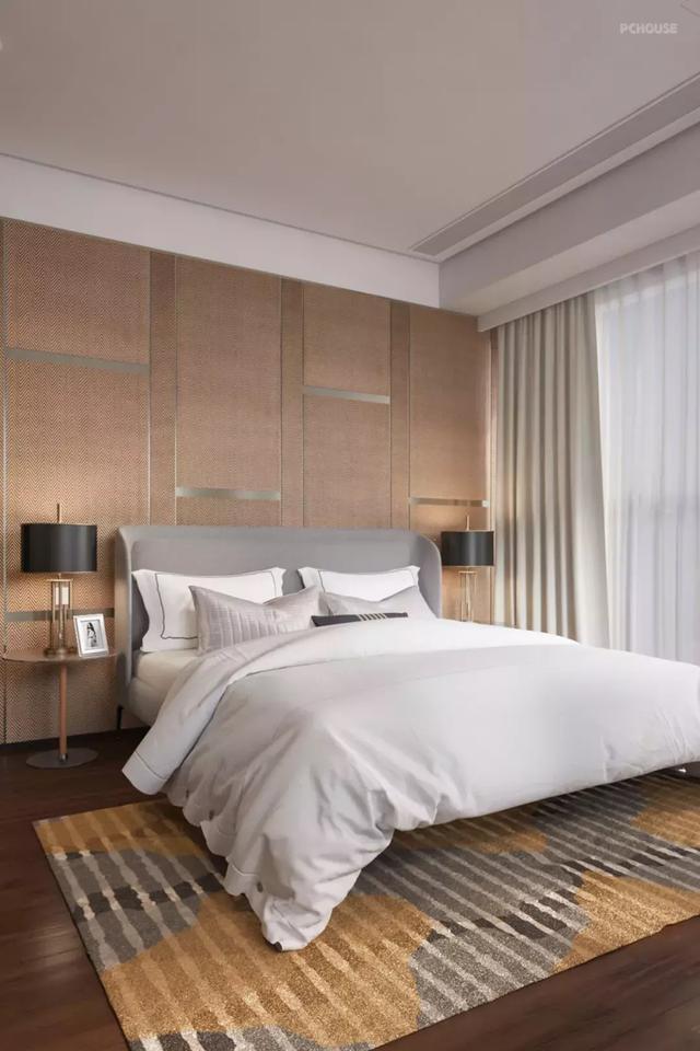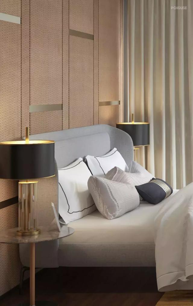主卧背景墙嵌有香槟金线条,两侧衬以古朴精致的床头灯,瞬间丰富了整个空间的层次。