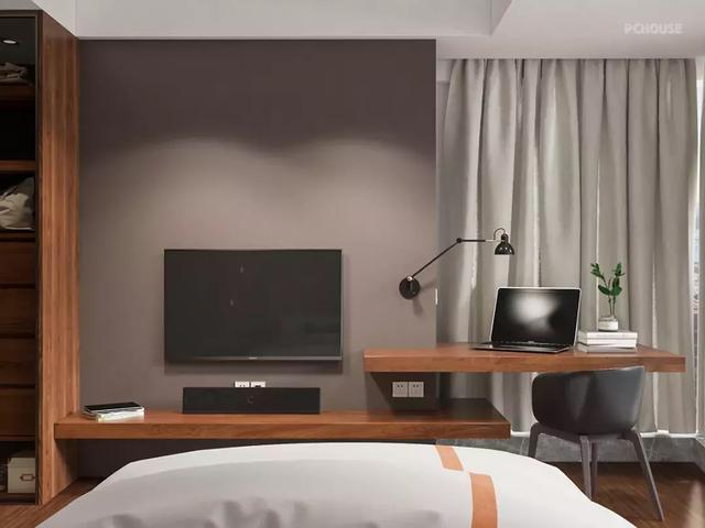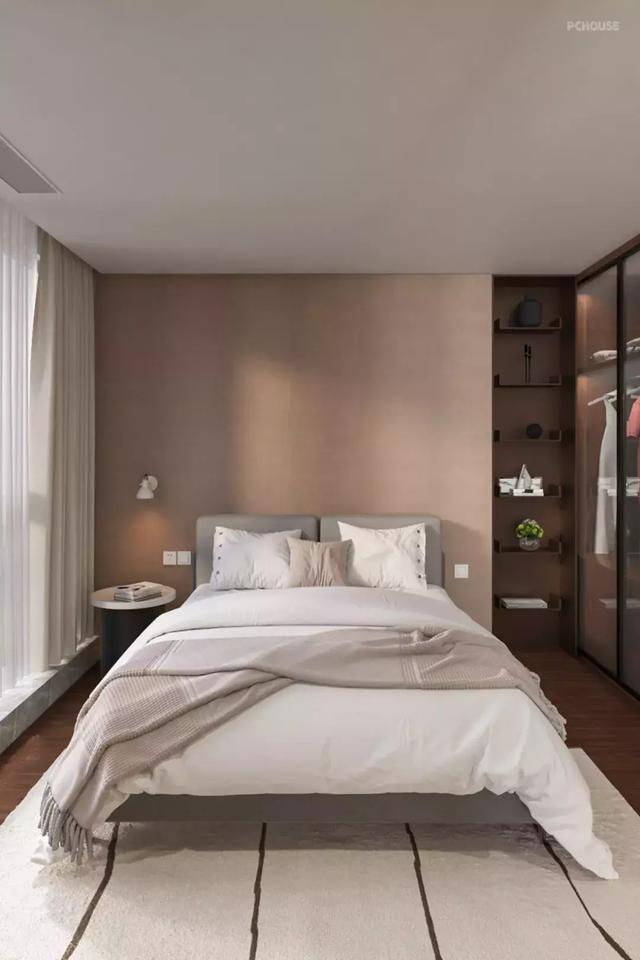 触感温润的胡桃木衣架以及浅灰色的软包大床,又营造出空间的高雅温馨之感。