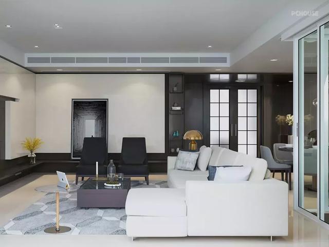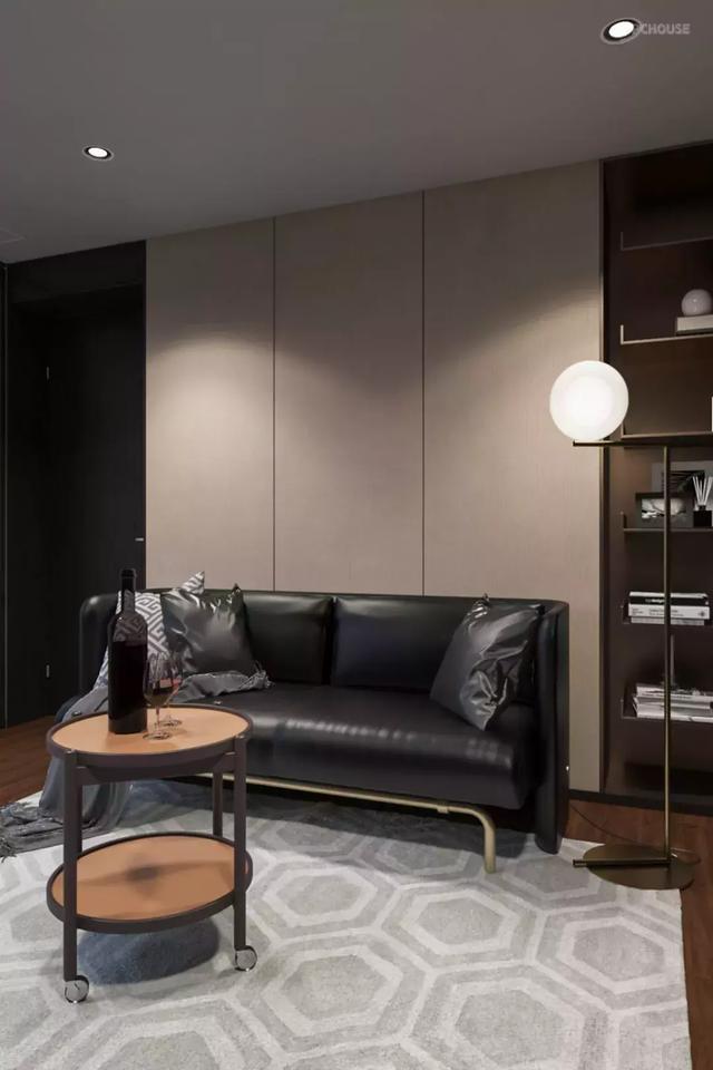 起居室里金属质感的灯具与皮革沙发黑金相配,强烈的对比冲撞视觉,而中和它们的是地板原木色的温润、背景的留白以及光感的柔和。