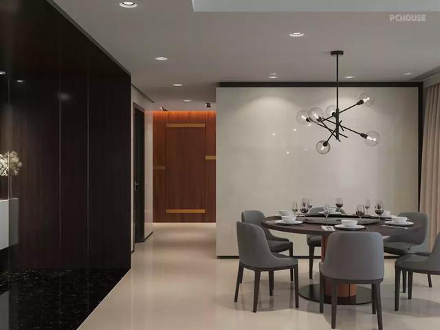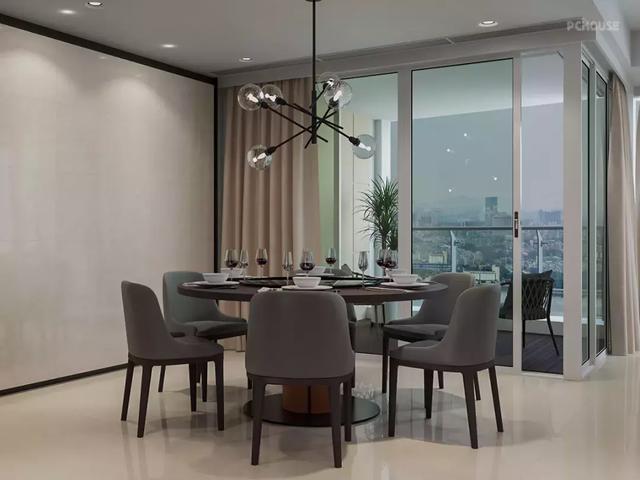 连接阳台的餐区景致超然,创意十足的分子吊灯以其刚硬的线条,在柔和空间中增添了一丝力量感,别有一番意趣。