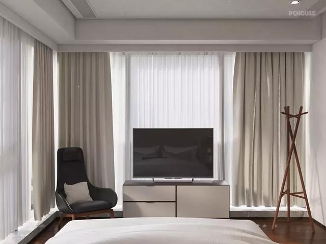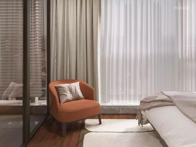 次卧的大落地玻璃,剪除多余的装饰,让光和影最大限度占据空间。